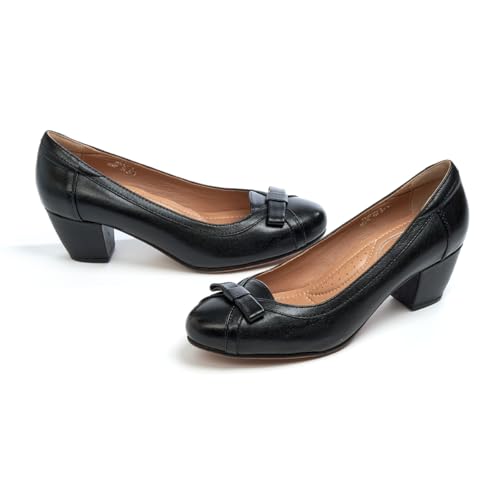 Mona flying Women's Leather 5 cm Pump Chunky Med Heel Round Toe Office Dress Shoes for Ladies 5