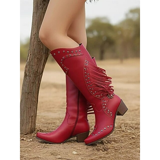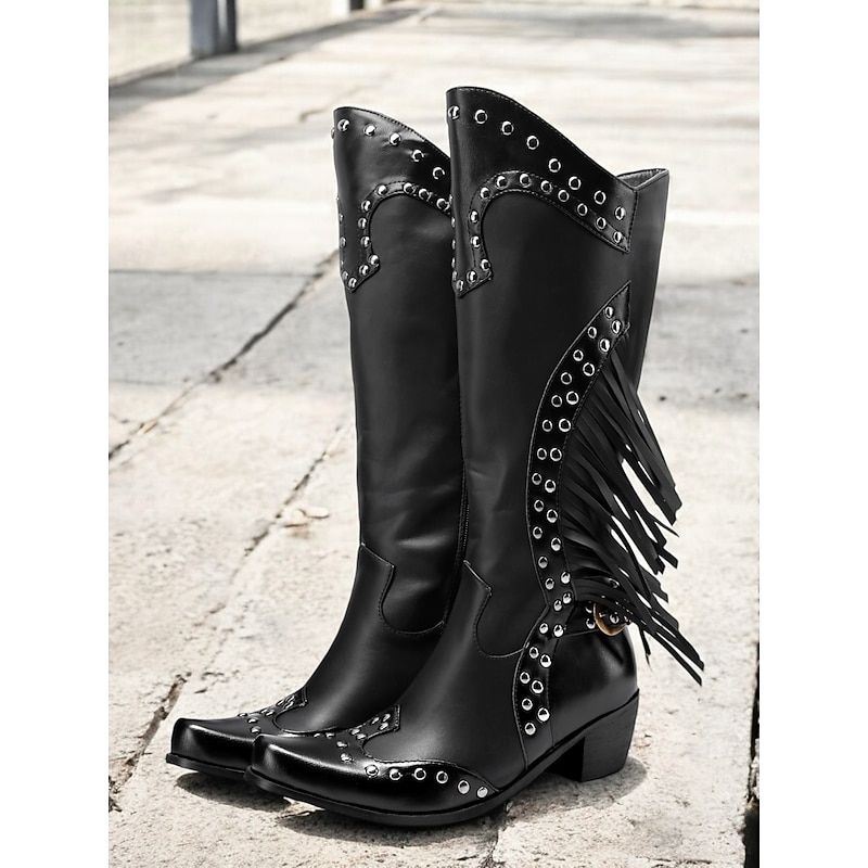 The boots boast an intricate western-inspired design with detailed stud embellishments along the top and side seams, complemented by long leather fringe accents that enhance their rustic charm. The slightly slanted, stacked heel completes the classic cowboy look, blending style and function.