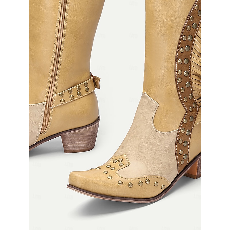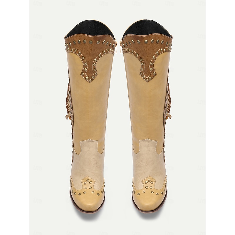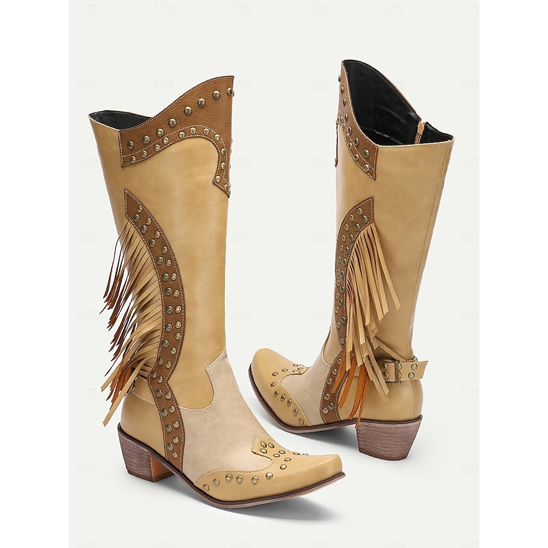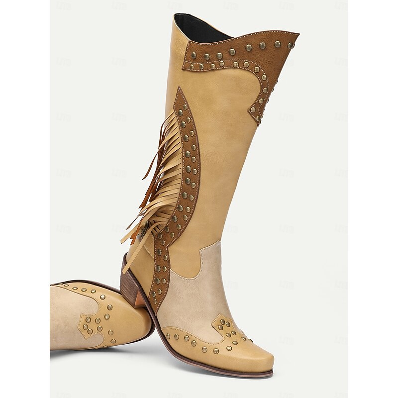 Women's Tan Western Cowboy Boots with Fringe and Studded Details, Vintage Knee-High Boots for Rodeo and Country Outfits