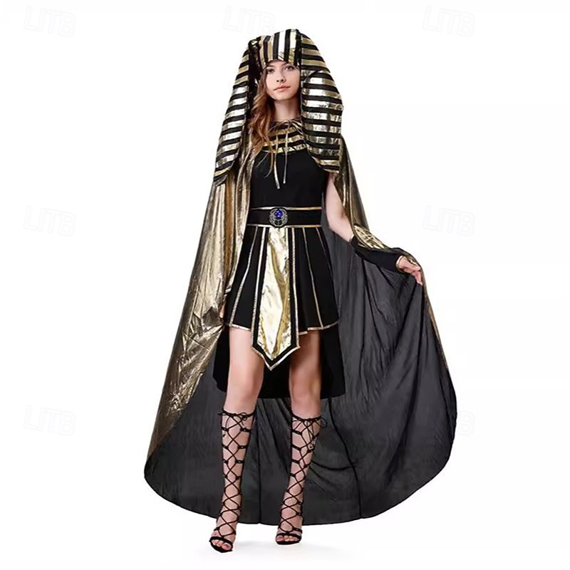 Inspired by the grandeur of ancient Egypt, the costume boasts a striking black and gold color scheme. It includes a headdress with distinctive black and gold stripes that echo the traditional pharaoh headpieces, giving it an authentic and commanding presence. The waist is cinched with a decorative belt featuring a blue gemstone-like detail, elevating the luxury of the design.