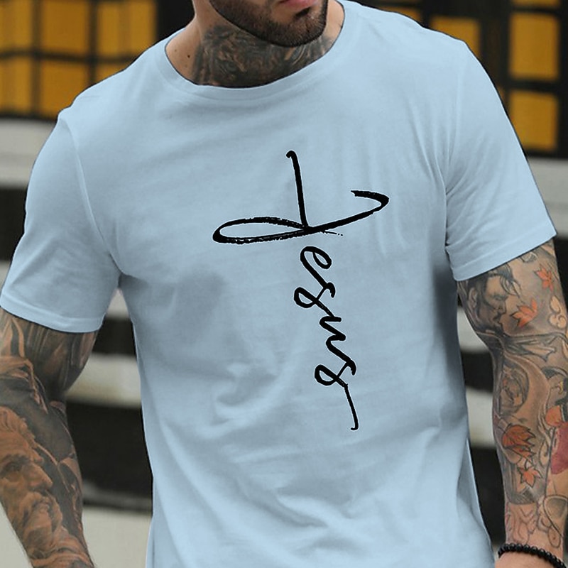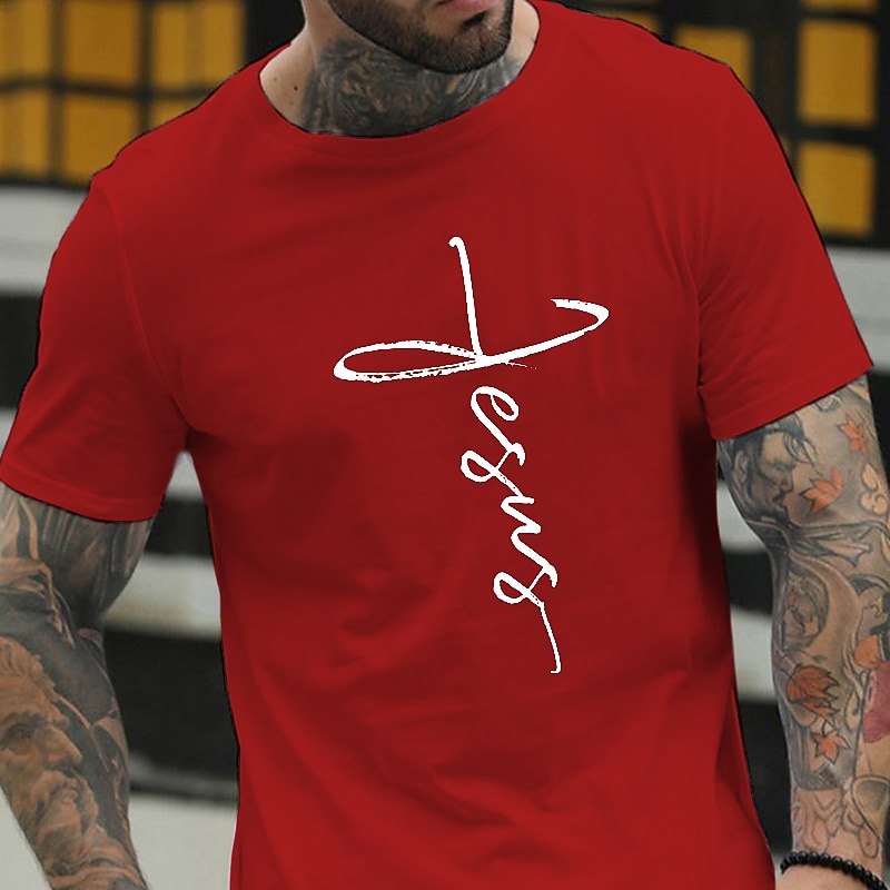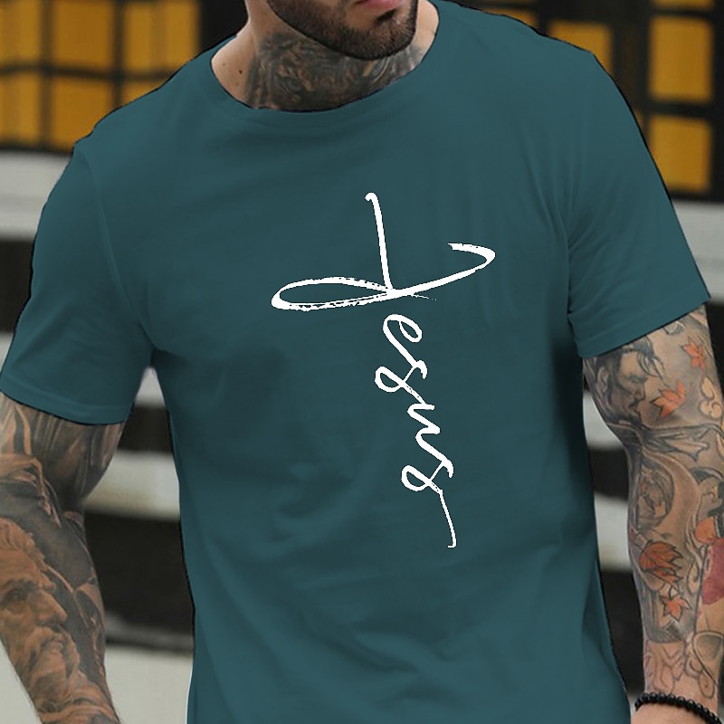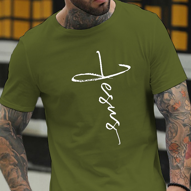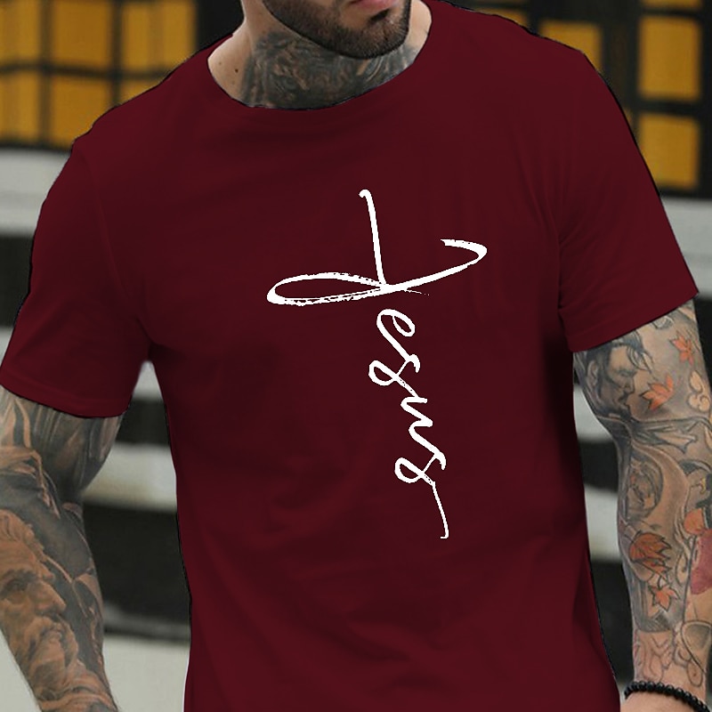 Highlights [Fabric] : Crafted from 100% soft cotton, this men's t-shirt offers a comfortable and breathable fit, ideal for maintaining ease throughout your day. The micro-elasticity of the fabric ensures a flexible wear, making it suitable for various activities. [Fit] : Featuring a regular fit silhouette, this tee suits various body types and is perfect for layering or wearing solo. The short sleeves and crew neck design provide a classic touch, ensuring it remains a staple in casual wardrobes. [Design Highlights] : The t-shirt showcases a bold letter print depicting "Jesus" in an artful script that forms a cross shape on the front, adding a meaningful element to its aesthetic. Available in a variety of stylish colors, including navy blue, wine red, and army green, it caters to personal style preferences with ease. [Occasions] : Perfectly suited for casual outings, vacations, and holidays, this versatile tee complements relaxed and sports-oriented looks alike, offering a blend of comfort and faith-inspired fashion. [Sizing] : Available in a range of sizes from S to XXL, this t-shirt caters to diverse fits, ensuring an option for everyone seeking both style and comfort in their everyday clothing choices.