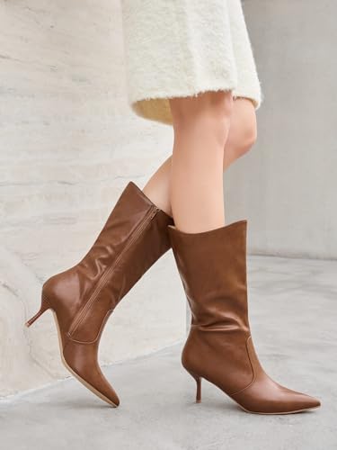 Coutgo Womens Mid Calf Boots Pointed Toe High Heel Long Boots Side Zipper Winter Dress Shoes 6