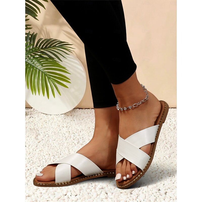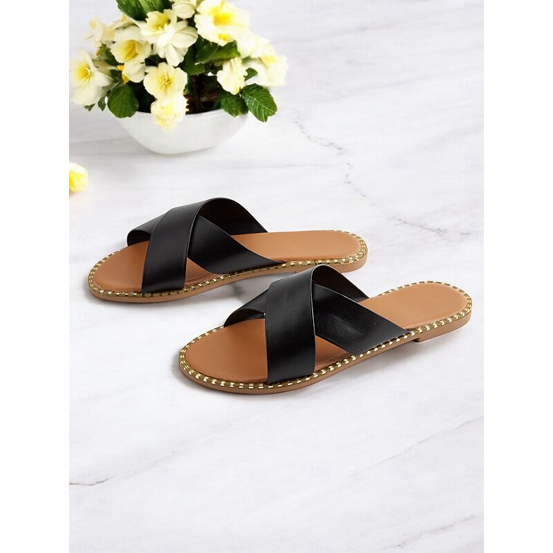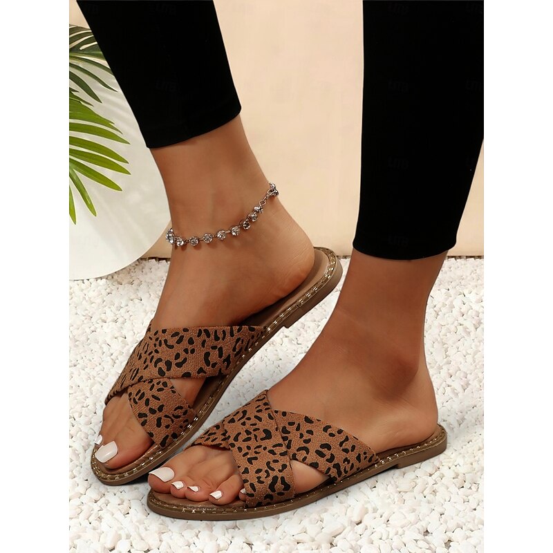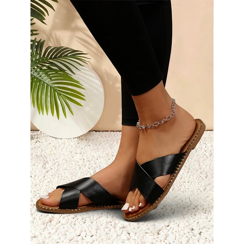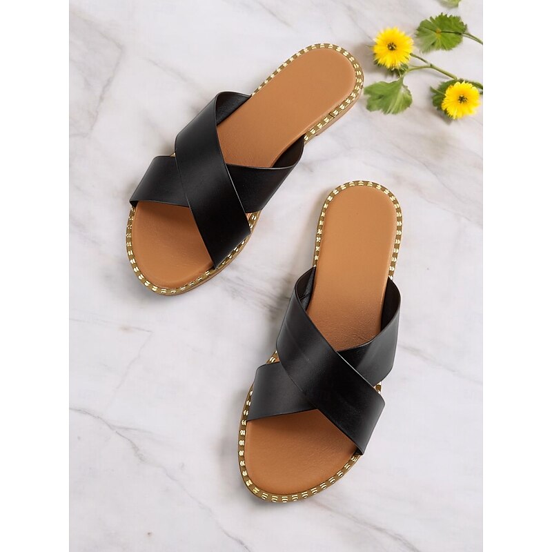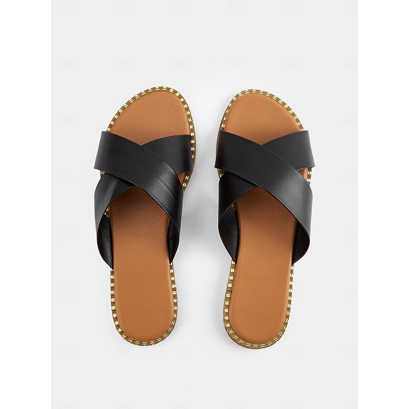 HOT ! Light Brown Cross-Strap Flat Slide Sandals for Women - Casual Summer Slip-Ons with Comfortable Sole