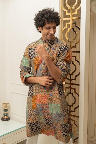 • This kurta stands out with an eye-catching multicolor patchwork and foil print, adding a contemporary twist to traditional wear.