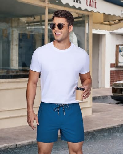 • [2 in 1 Mens Swim Trunks with Compression Liner]The mens 5 Inch swim trunks of premium fabric, which is made of polyester and spandex. Have a Stretch Built-in compression lining protects your skin from scratch and prevents from sticking to your skin when the shorts are soaked. while provides better breathability and elasticity.