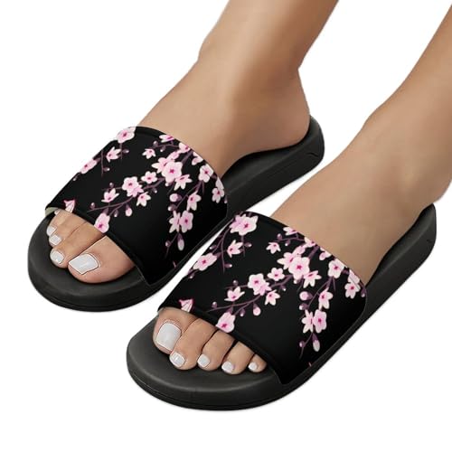 Floral Cherry Blossoms Black Pink Womens Slide Sandals Non Slip Summer House Slippers for Girls Slip-on Flip Flops 7