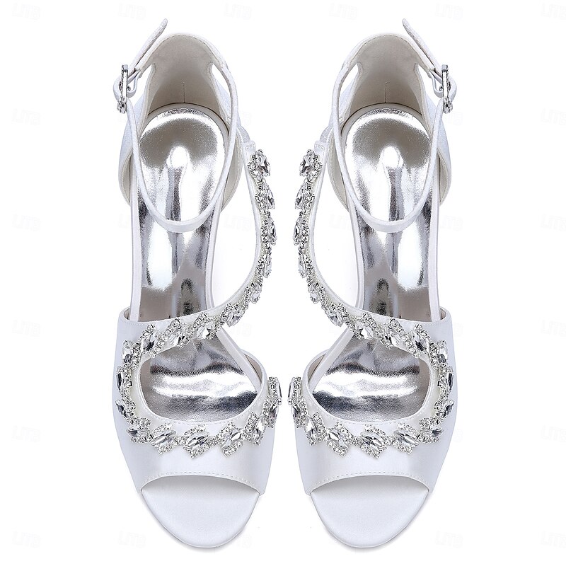 Women's White Stiletto Heels with Crystal Embellishments and Ankle Strap - Elegant Peep-Toe Dress Sandals for Cocktail Parties and Formal Events 25