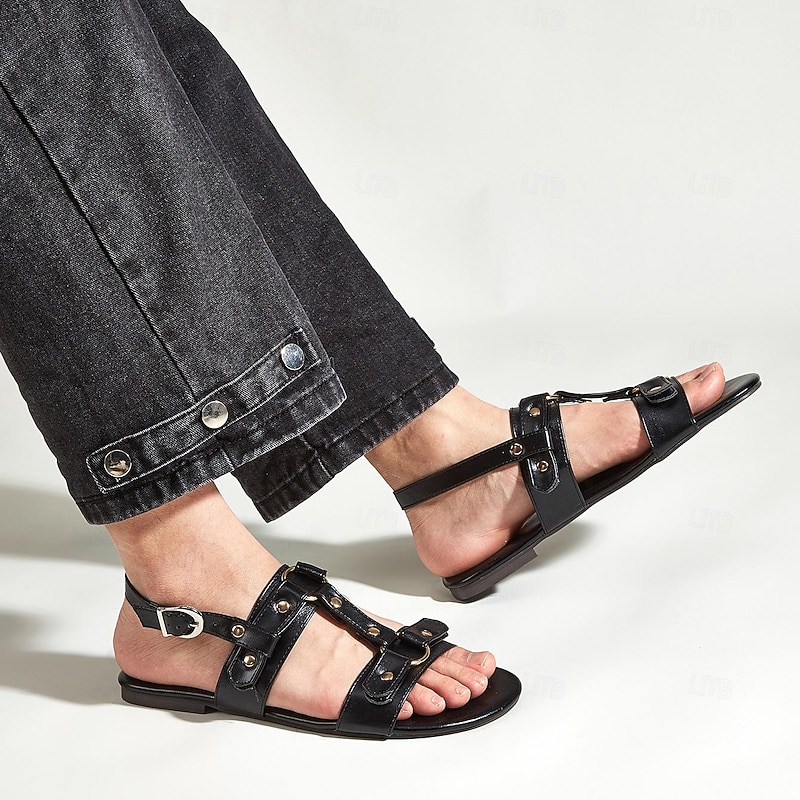 Highlights [Men's PU Leather Gladiator Sandals Highlights] [Material & Fabric]: Crafted from high-quality PU leather, these sandals feature a leather-like finish that adds a sleek and timeless touch. The material is durable yet breathable, ensuring comfort throughout long summer walks and casual outings. [Style & Fit]: Designed with a classic gladiator aesthetic, these sandals flaunt a strappy construction that hugs the foot securely. The round toe shape and flat rubber outsole ensure a comfortable fit, while the adjustable buckle closure offers customizability to accommodate various foot shapes, providing both style and ease of wear. [Design Highlights]: The sandals incorporate metallic hardware details on the buckles, adding a sophisticated edge to the vintage-inspired design. The overall black color and sleek features allow these sandals to seamlessly transition from daytime beach trips to evening casual gatherings. [Ideal Occasions]: Perfect for vacation, beach outings, and casual daytime wear, these sandals pair effortlessly with various attire—from casual denim to light summer outfits, making them an essential addition for warm-weather wardrobes. [Size Range]: Available in a variety of sizes to suit different needs, these sandals come in US sizes ranging from 6 to 12, ensuring a suitable fit for everyone seeking both comfort and style in their summer footwear choice.