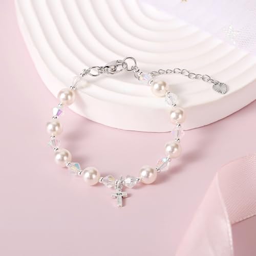HOT ! Pearl Cross Bracelets for Girls, Sterling Silver Baby Bracelet, Baptism Gifts for Girl, Christening and First Communion Christian Jewelry Gift for Kids