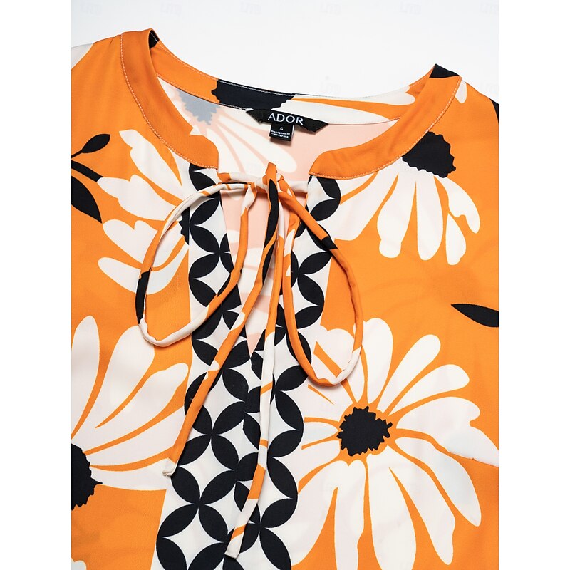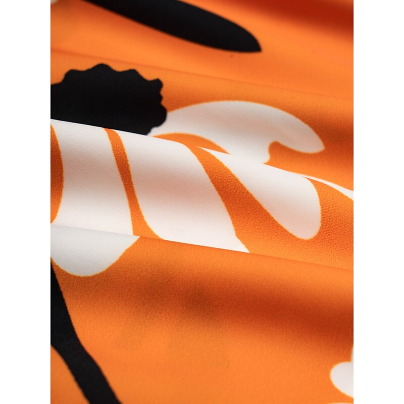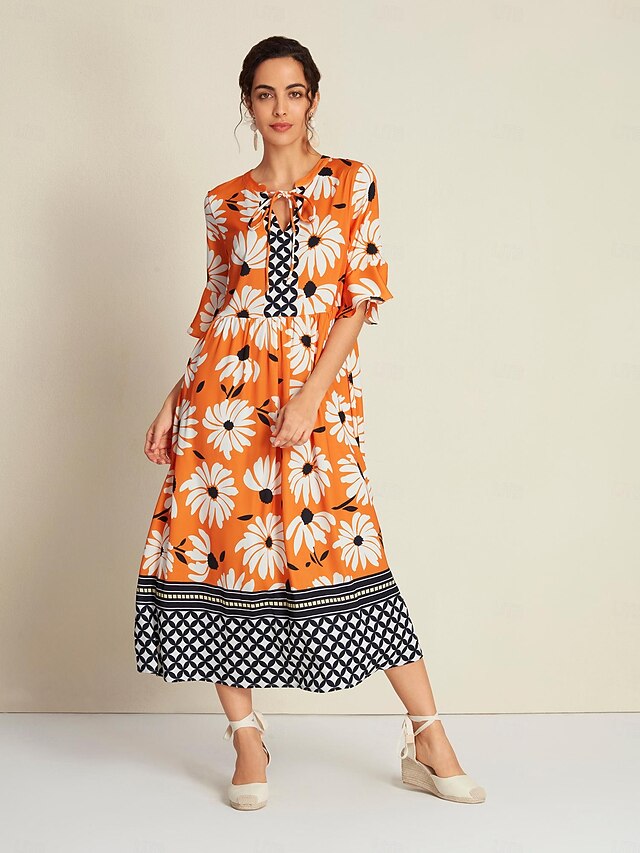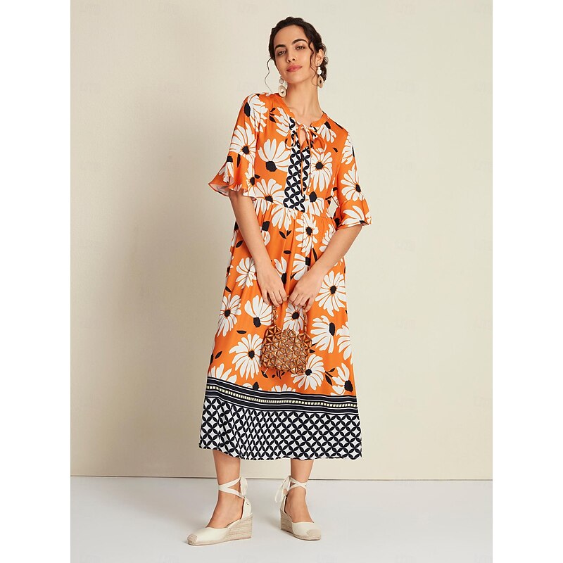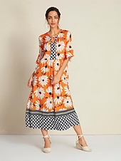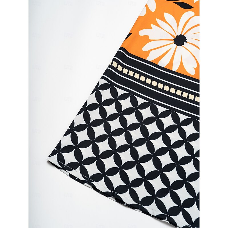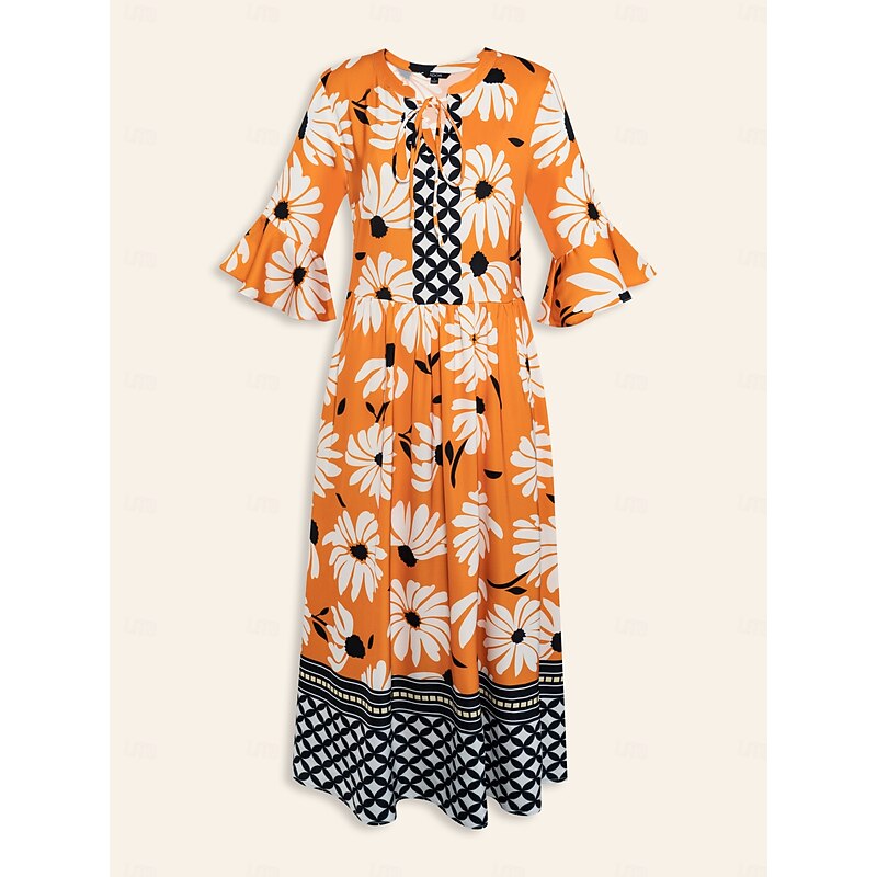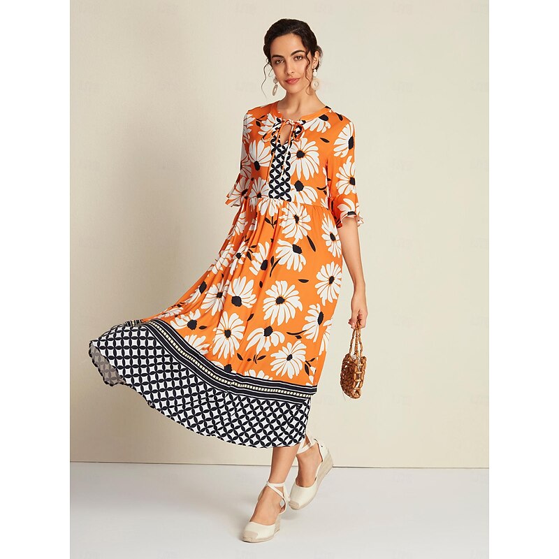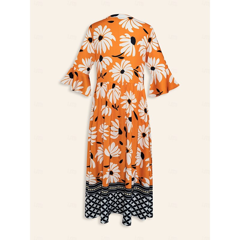 More information about Satin Geometric Mid Waist 3/4 Length Sleeve Standing Collar V Neck Maxi Dress