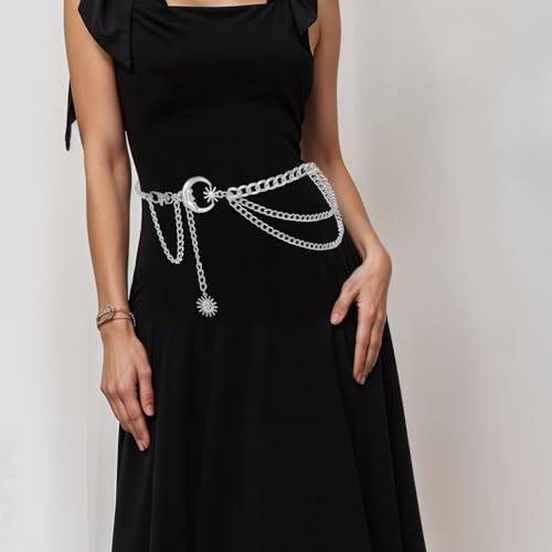 3 Layered Body Belly Belt Metal Waist Chain Moon and Sun Chain Silver Fashion Multilayer Link Belts Jewelry Accessories for Women Jeans Dresses Party Country Concert Outfits 6