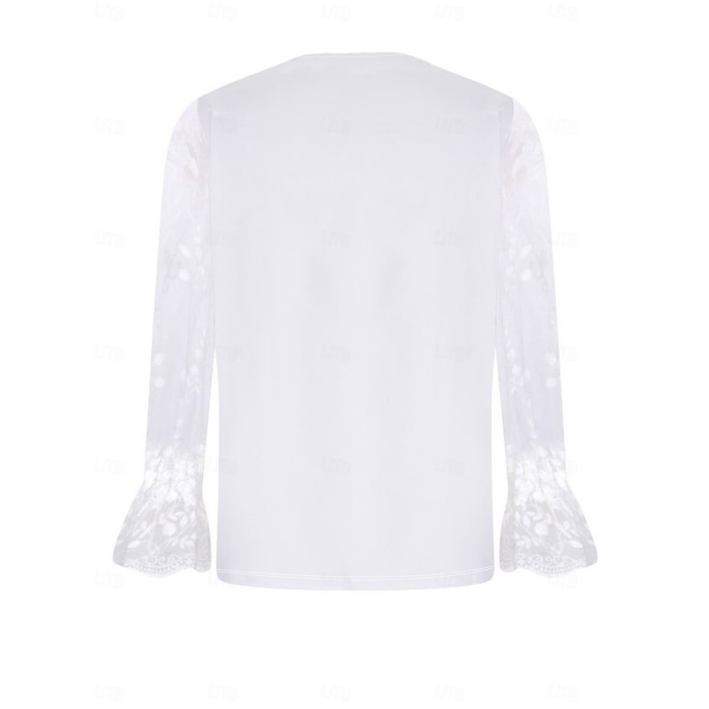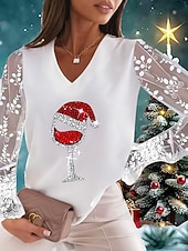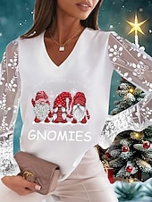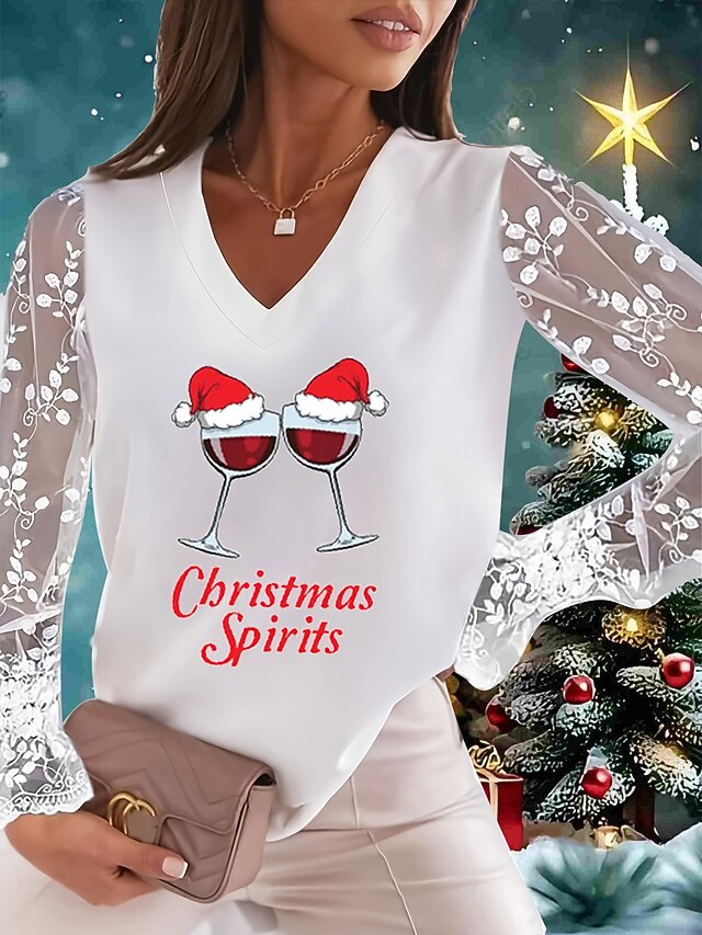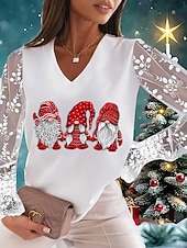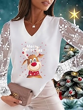 More information about Christmas Women's T Shirt Lace Splicing Top Graphic Ugly Christmas Elegant Fashion Cute Long Sleeve Lantern Sleeve V Neck Regular Tops Going out Weekend Lace Patchwork Black and White Pearl White