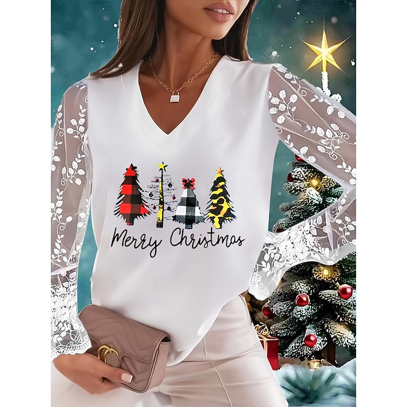 Christmas Women's T Shirt Lace Splicing Top Graphic Ugly Christmas Elegant Fashion Cute Long Sleeve Lantern Sleeve V Neck Regular Tops Going out Weekend Lace Patchwork Black and White Pearl White 17