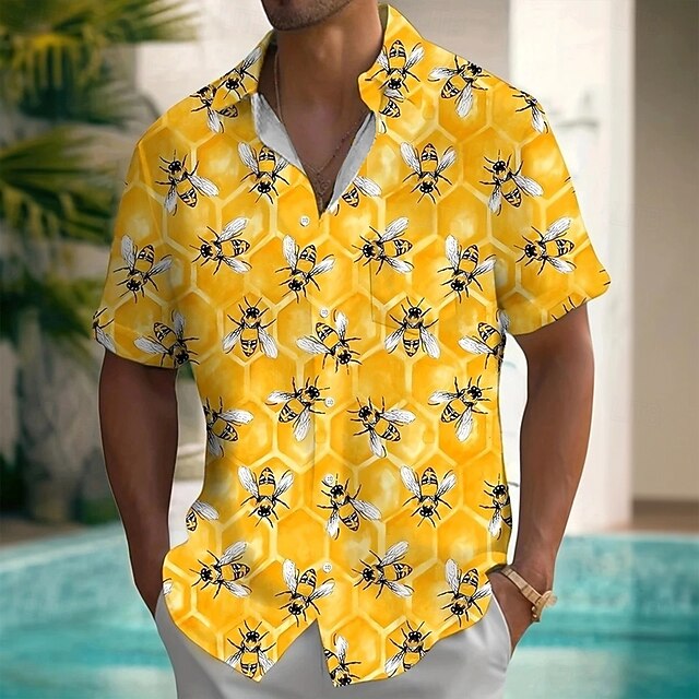 HOT ! Men's Bee Funny Beehive Shirt Summer Hawaiian Shirt Button Up Shirt Short Sleeve Hawaiian Vacation Holiday Beach Wear Summer Spring Turndown 3D Print Collared Shirts Front One Pocket Yellow