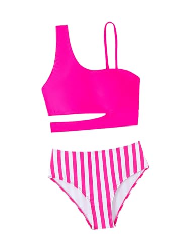 SHENHE Girl's 2 Piece One Shoulder High Waisted Cut Out Bikini Swimsuit Bathing Suit Striped Hot Pink 16 Years 2