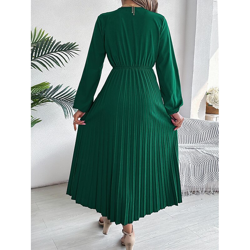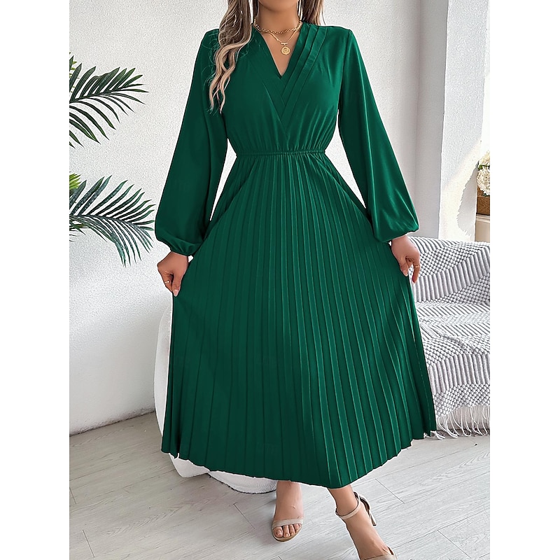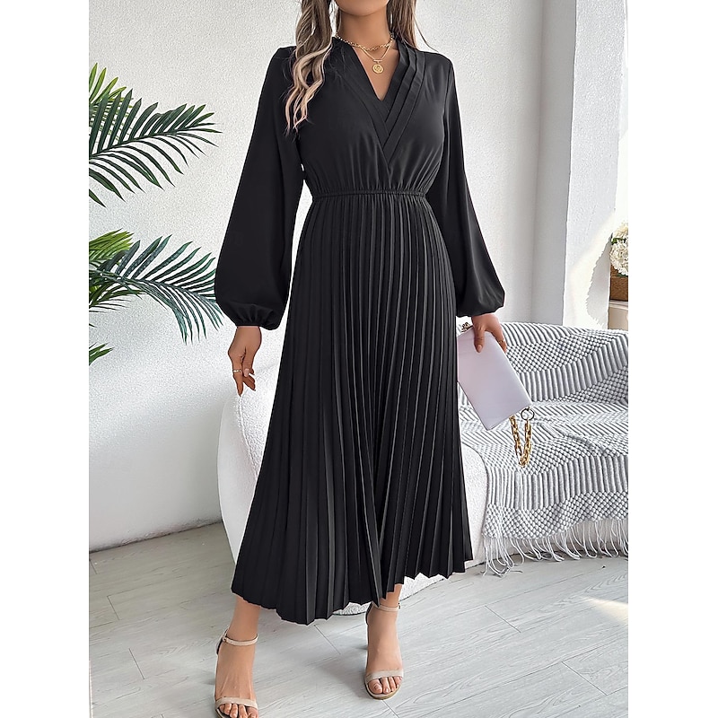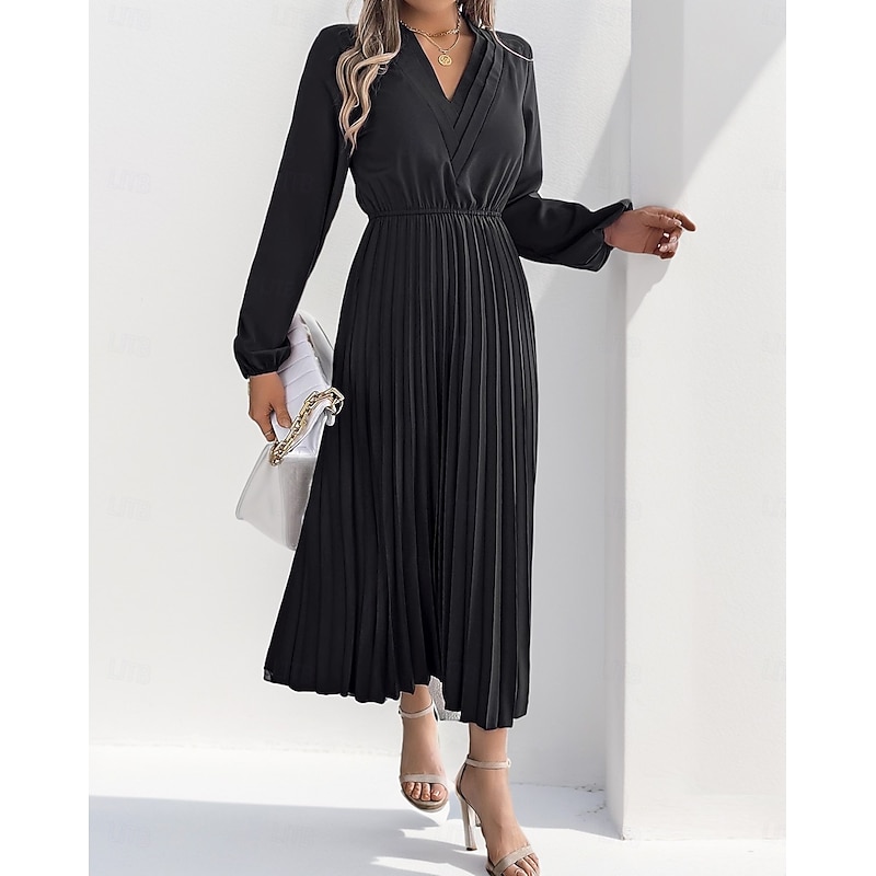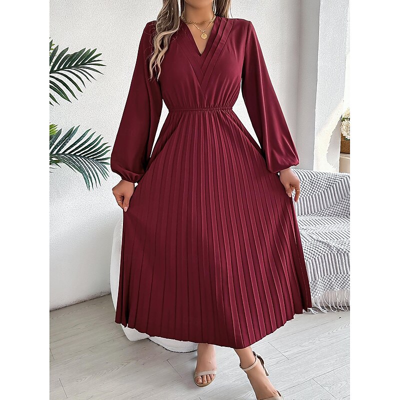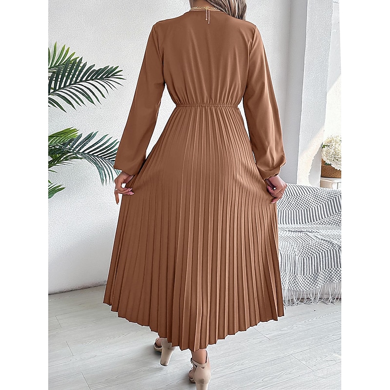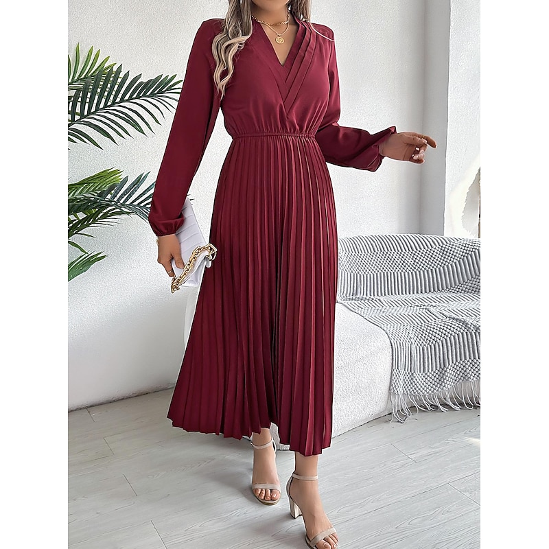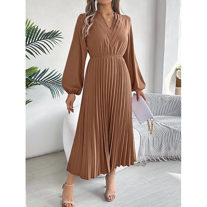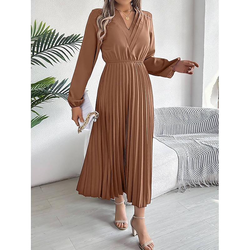 More information about Women's Work Dress Satin A Line Dress Fashion Office Long Dress Maxi Dress Pleated V Neck Long Sleeve Plain Regular Fit Black Wine Brown Spring Fall S M L XL