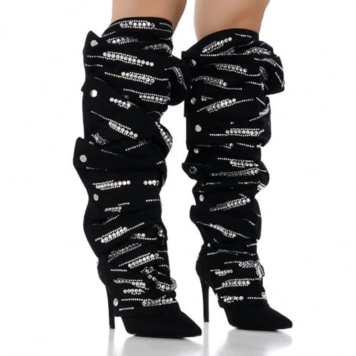 Women's suede Sparkly Rhinestone Stiletto Knee High Pointed Toe Zipper High Heel Shark Boots 6