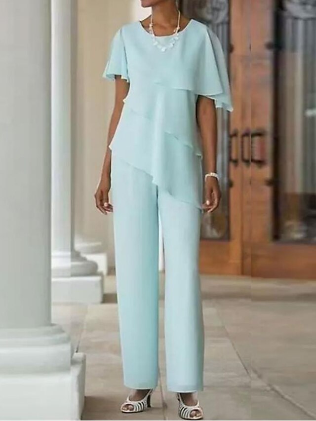 More information about Two Piece Pantsuit Mother of the Bride Wedding Guest Elegant Plus Size Jewel Neck Floor Length Chiffon Short Sleeve with Cascading Ruffles