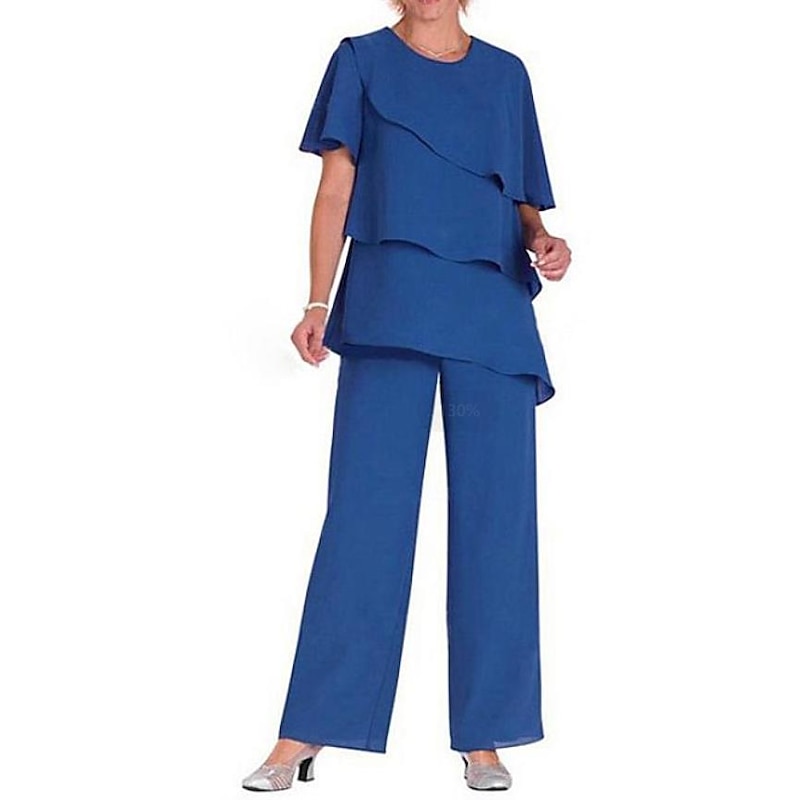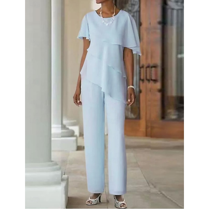 HOT ! Two Piece Pantsuit Mother of the Bride Wedding Guest Elegant Plus Size Jewel Neck Floor Length Chiffon Short Sleeve with Cascading Ruffles