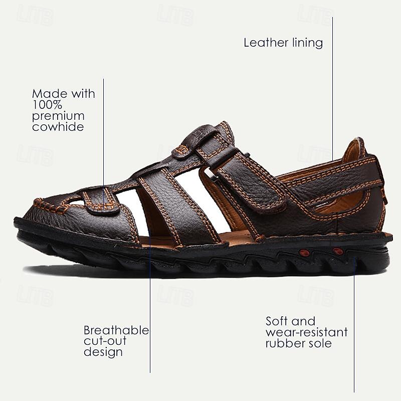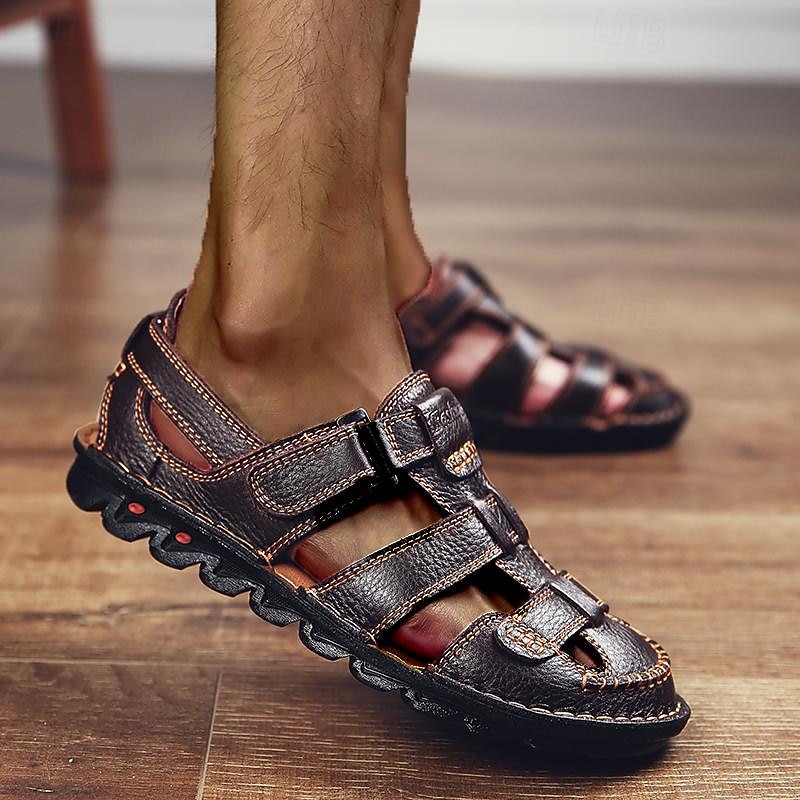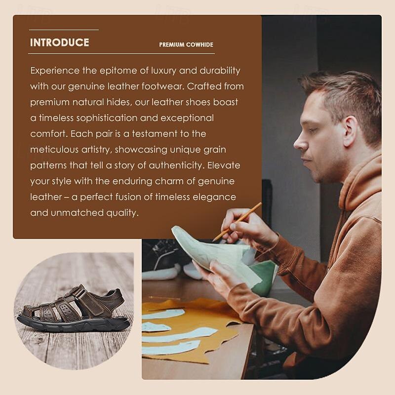 Highlights [Fabric] : Crafted from Italian full-grain cowhide, these men's sandals boast an upper of genuine leather that delivers a luxurious and durable finish. The smooth texture and rich coloring are enhanced by detailed contrasting stitching, creating an intricate and refined appearance. [Style & Fit] : Designed in a classic fisherman sandal style, these shoes combine an open toe with a closed heel for optimal comfort and breathability. Featuring a convenient lace-up closure, they allow for an adjustable, secure fit tailored to your preferences. [Design Highlights] : These sandals showcase a distinct leather texture complemented by a metal buckle that adds a touch of elegance. The high-quality rubber outsole offers excellent traction and cushioning, making them both functional and stylish. [Occasions] : Ideal for summer hiking and casual outings, these sandals provide the perfect blend of functionality and sophistication. Whether you're on a weekend adventure or enjoying a leisurely stroll, their comfort and breathability make them a versatile choice for various activities. [Size Range] : Available in a diverse range of sizes, from US5 / EU38 / UK4 to US13 / EU46 / UK12, ensuring the perfect fit for every foot.