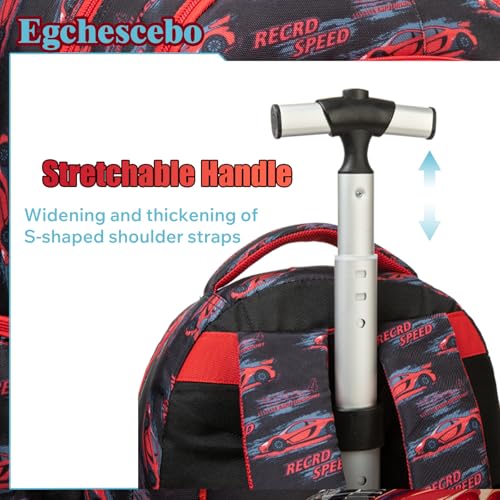 • Our Egchescebo Boys' Large Capacity Rolling School Bag contains 1 large main pocket, 1 zippered front pocket, 2 mesh organizer pockets, 1 lunch bag, 1 pencil pocket; this school bag has enough space for all of your child's school supplies, such as pencils, notebooks, cell phones, books and more.