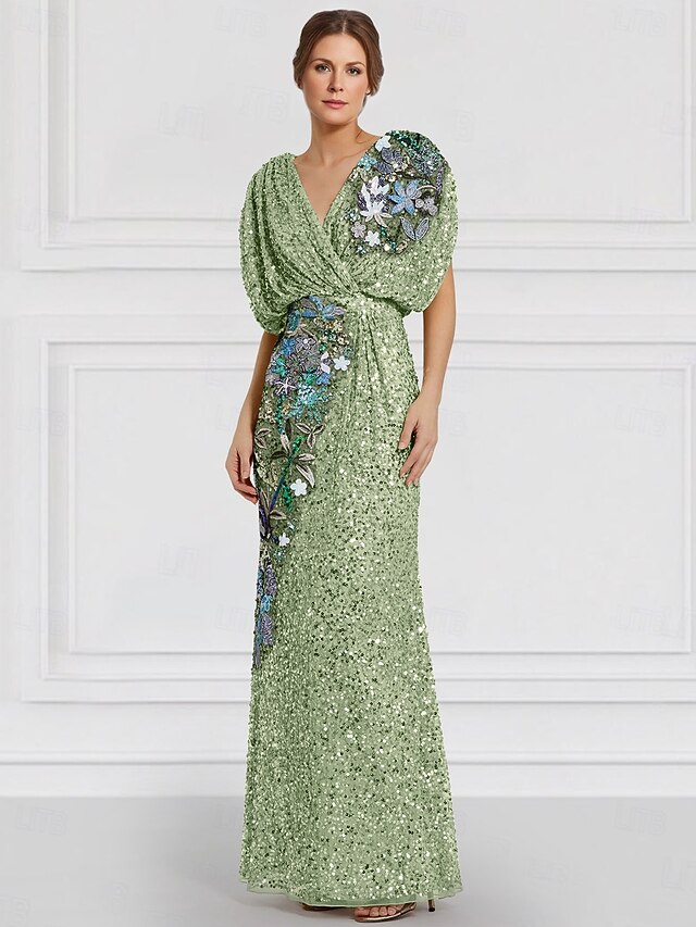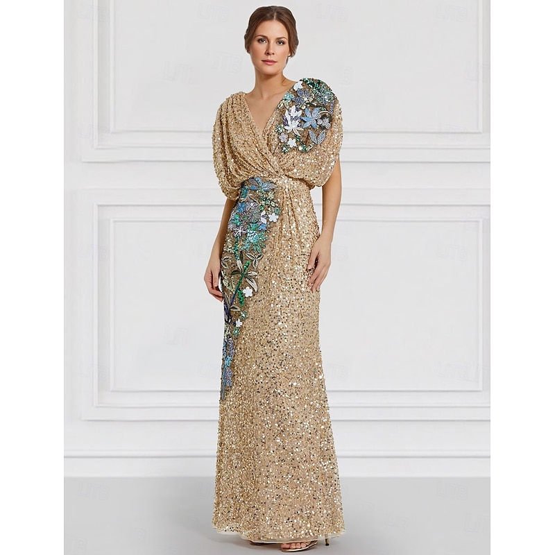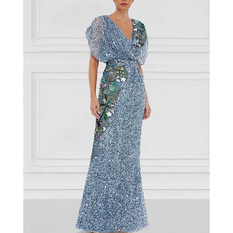 More information about Column Evening Gown Embroidered Elegant Dress Formal Wedding Floor Length Short Sleeve Jewel Neck Sequined with Glitter