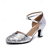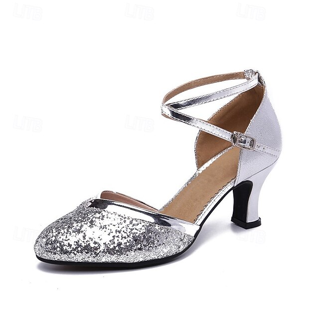 Highlights [Fabric] : Crafted with a beautifully shimmering silver glitter design, these women's dance shoes feature an upper adorned with paillettes that create a stunning, sparkling effect. The lining made from quality fabric ensures a comfortable fit. [Style] : These shoes boast a classic pointed toe that elegantly elongates the foot, offering a sophisticated silhouette suitable for formal events. The thick Cuban heel provides not only style but also stability, optimal for extended wear during dance performances or special occasions. [Design Highlights] : The cross-strap design is complemented by an adjustable buckle closure, providing a secure fit and an added touch of flair. The cushioned insole enhances comfort, making these shoes ideal for hours on the dance floor, while the leather outsole ensures reliable traction. [Occasions] : Perfect for ballroom and Latin dancing, these versatile shoes are also suitable for performances, square dances, or any special occasion where making a stylish statement is desired. Their elegant glitter finish elevates any ensemble, making them a standout choice for evening wear. [Size Notice] : Available in a wide range of sizes from US5/EU35 to US9.5-10/EU41, these shoes are designed to accommodate standard sizes. It's recommended that individuals with wider feet consider selecting a size up to ensure the best fit.