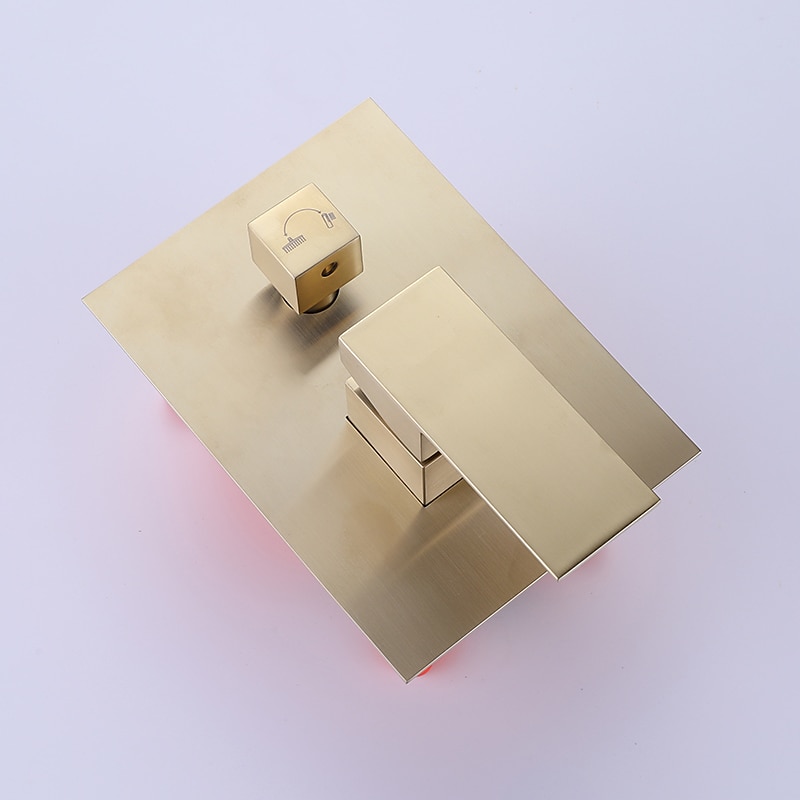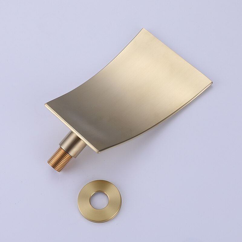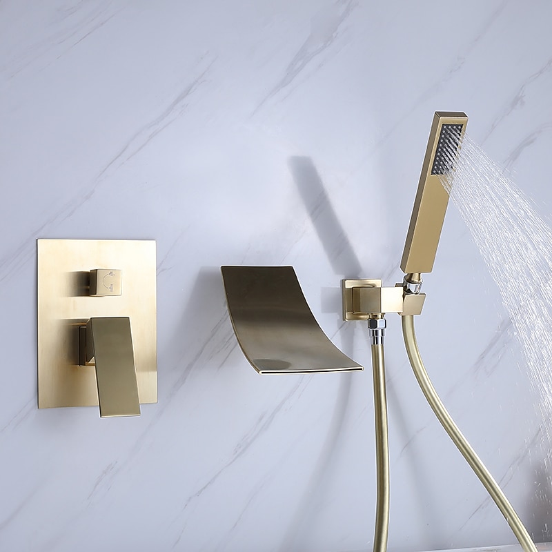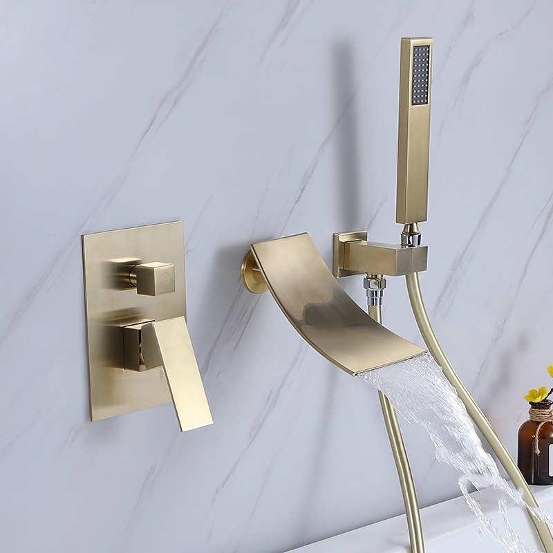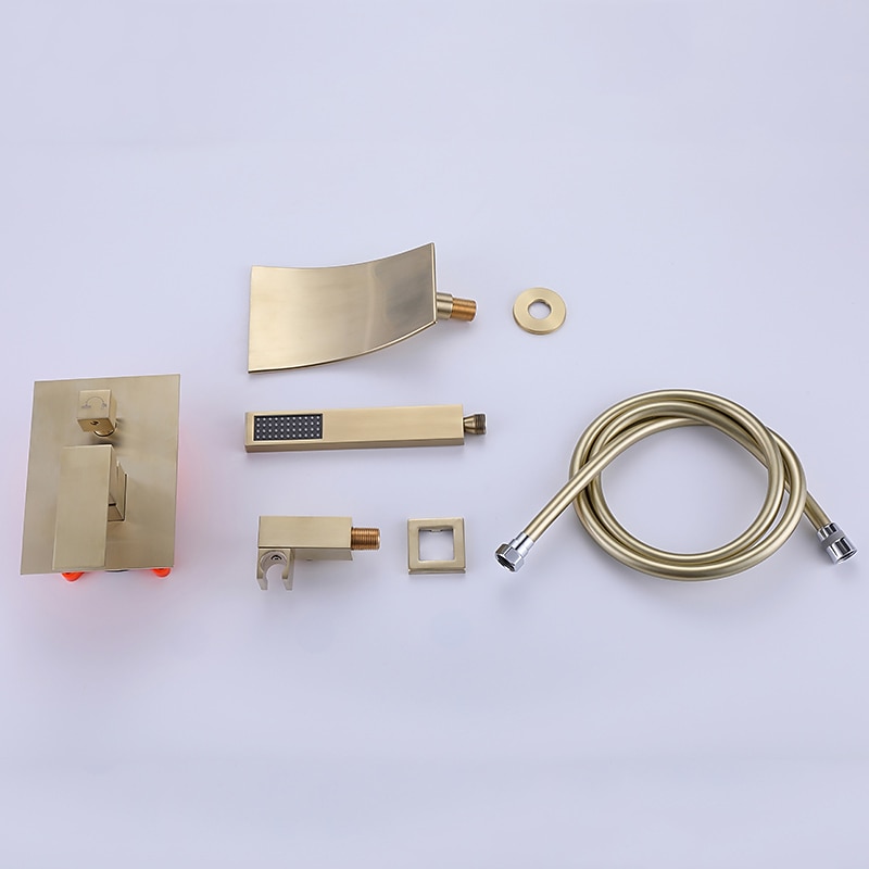 Highlights 1.Material: The shower nozzle and hose are made of high quality ABS and PVC. The shower controller, hand shower, spray spout, spray head and shower holder are all made of brass, thus ensuring the service life of the product. 2.Durable material: lead-free brass construction with corrosion resistant brushed gold finish and high quality. Ceramic disc valves exceed industry longevity standards, ensuring durable performance for a lifetime. 3.Ceramic 2-function valve: Allows easy and smooth function switching operations and a long service life. a single handle allows you to quickly adjust temperature and flow 4. Easy installation, assembly tools included. Cascading spout: a cascading bathtub tap with a curved and graceful cascading spout lets you fill the tub at high speed and adds a touch of style to any bathroom 5.Shower function controller: hot and cold brass shower valve. This valve is paired with the Rite-Temp pressure balance valve. The pressure balance valve filter element monitors the water pressure balance and helps prevent pressure from being scalded due to sudden changes in hot or cold water.