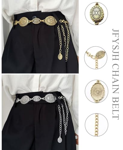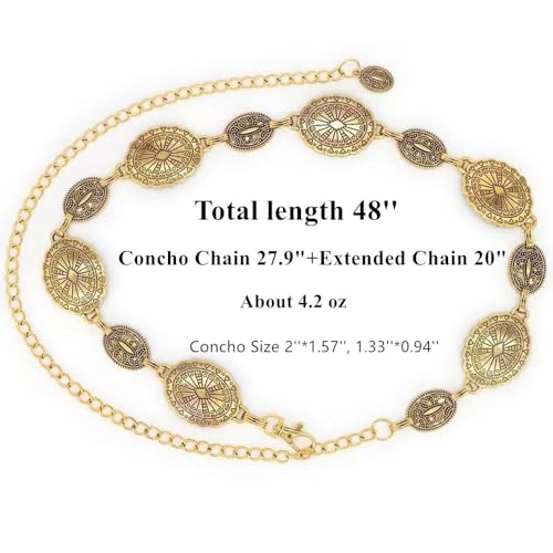 • ☀ Western Concho Chain Belt - The metal chain belt for women fashion features a western retro carved concho, a stylish combination of chains and punk-style metal elements for a cool and fashionable look, trendy and not easy to be out of date. The gold chain belt is a wardrobe must-have for all seasons