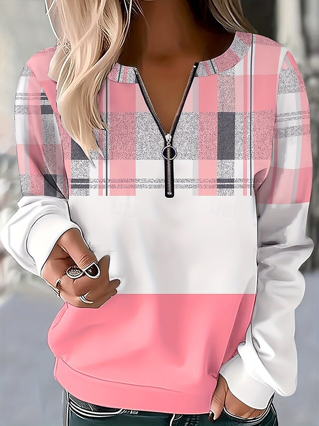 HOT ! Women's Pullover Sweatshirt Zip Up Sweatshirts Graphic Geometric Plaid Fashion Casual Long Sleeve Crew Neck Regular Tops Street Dailywear Zipper Print Light Pink Spring Fall Winter