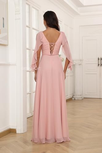 Cold Shoulder Bridesmaid Dresses with Sleeves for Women V Neck Chiffon A Line Pleated Formal Evening Gown 4