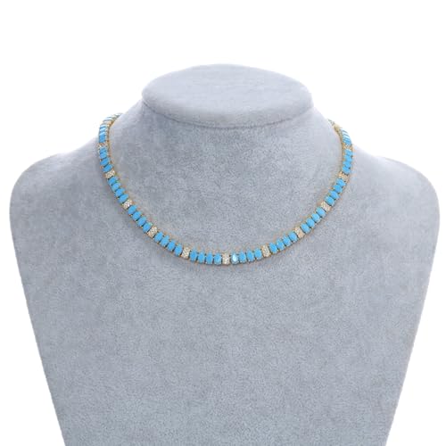 HOT ! Turquoise Tennis Necklace for Women – Gold Tone Brass Chain with Sparkling CZ Accents, Summer Statement Jewelry, Retro Chic Gift for Her