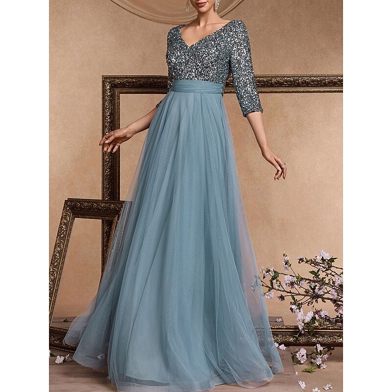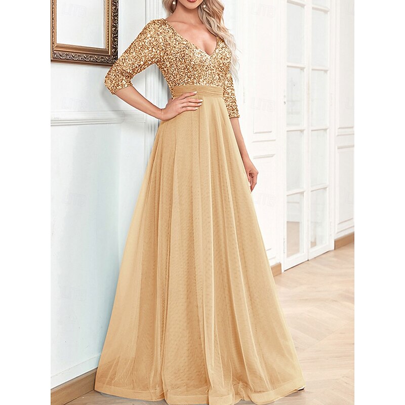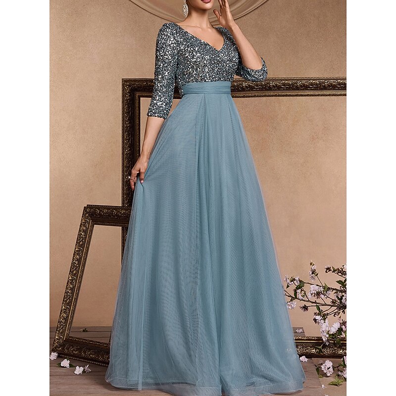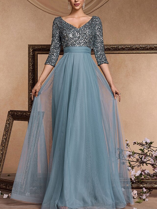 A-Line Evening Gown Elegant Dress Formal Wedding Floor Length 3/4 Length Sleeve V Neck Sequined with Sequin 16