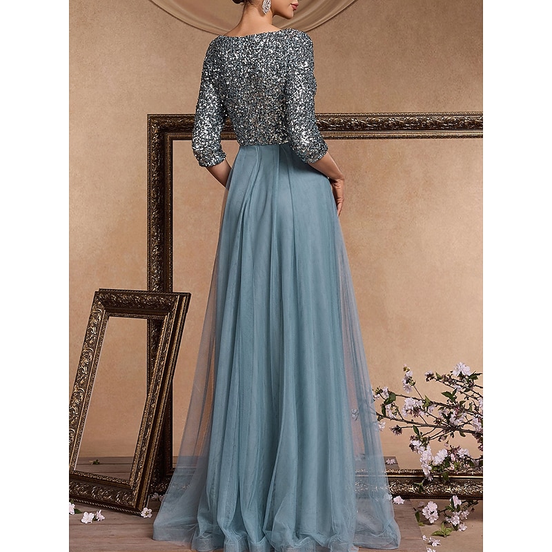 A-Line Evening Gown Elegant Dress Formal Wedding Floor Length 3/4 Length Sleeve V Neck Sequined with Sequin 4