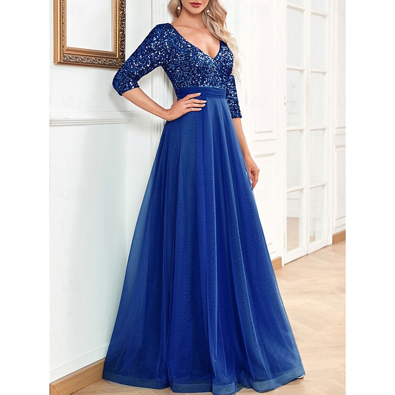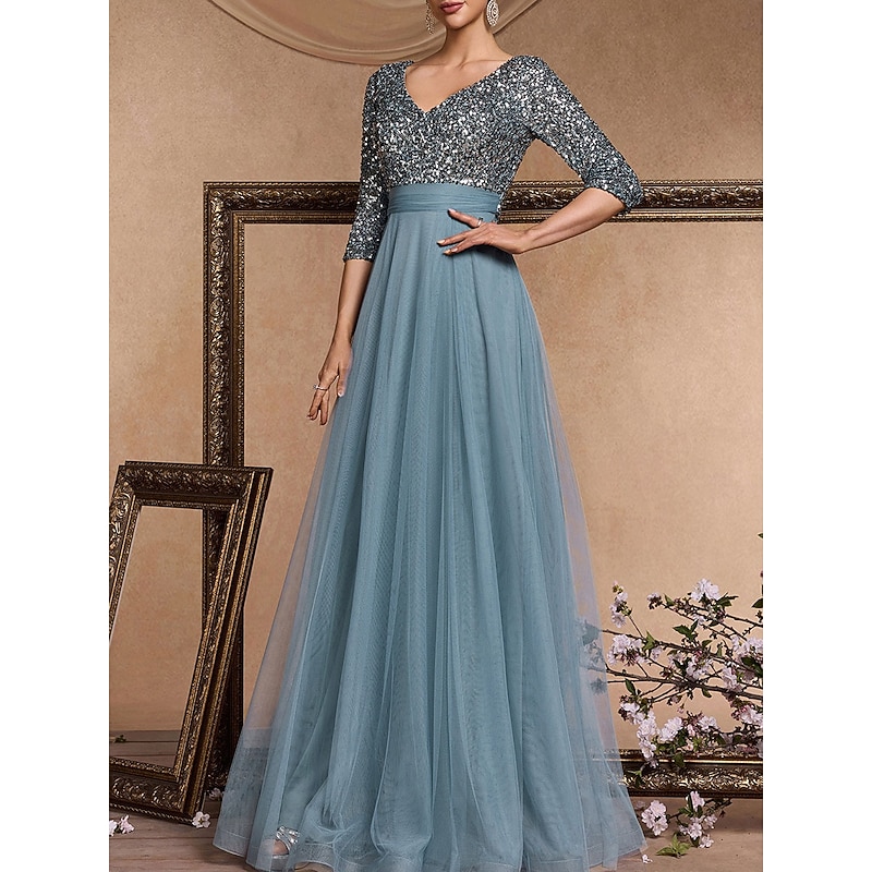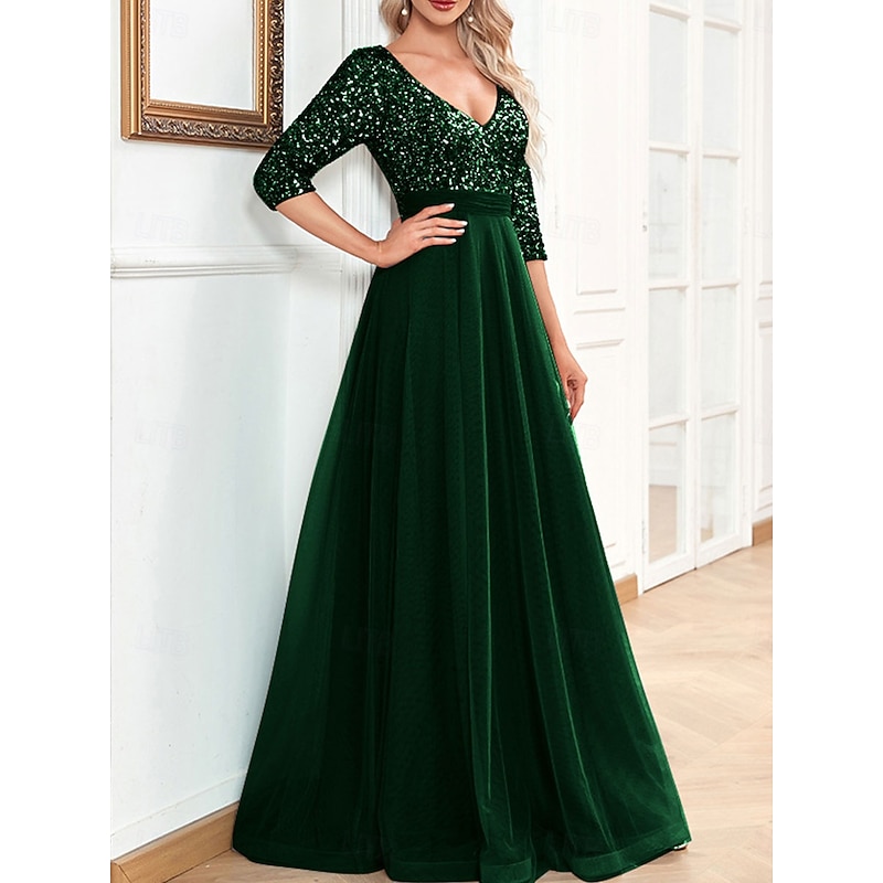 A-Line Evening Gown Elegant Dress Formal Wedding Floor Length 3/4 Length Sleeve V Neck Sequined with Sequin 1