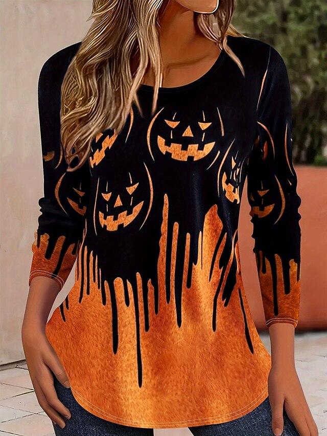 More information about Halloween Women's T shirt Pumpkin Ombre Graphic Vintage Stylish Classic Long Sleeve Crew Neck Regular Tops Daily Print Orange Fall Winter