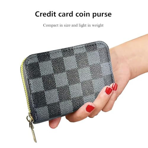Ladies change card bag, zip storage bank card case, small portable 11 large capacity pouch, holds banknote change credit card(Black checkered pattern) 1
