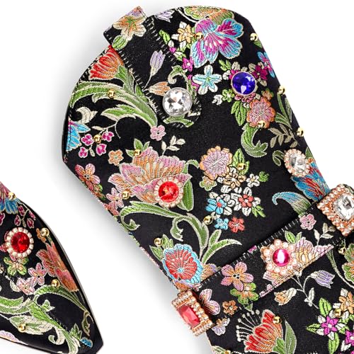 LOCERICH Women Rhinestone Cowboy Sparkly Cowgirl Boots Diamond Western Floral Embroidery Mid Calf Booties 6