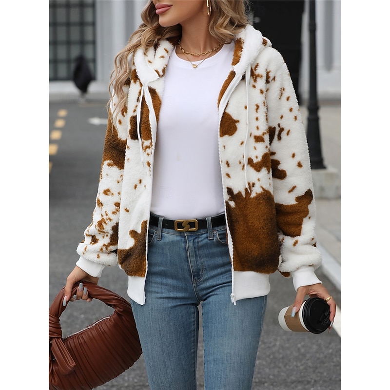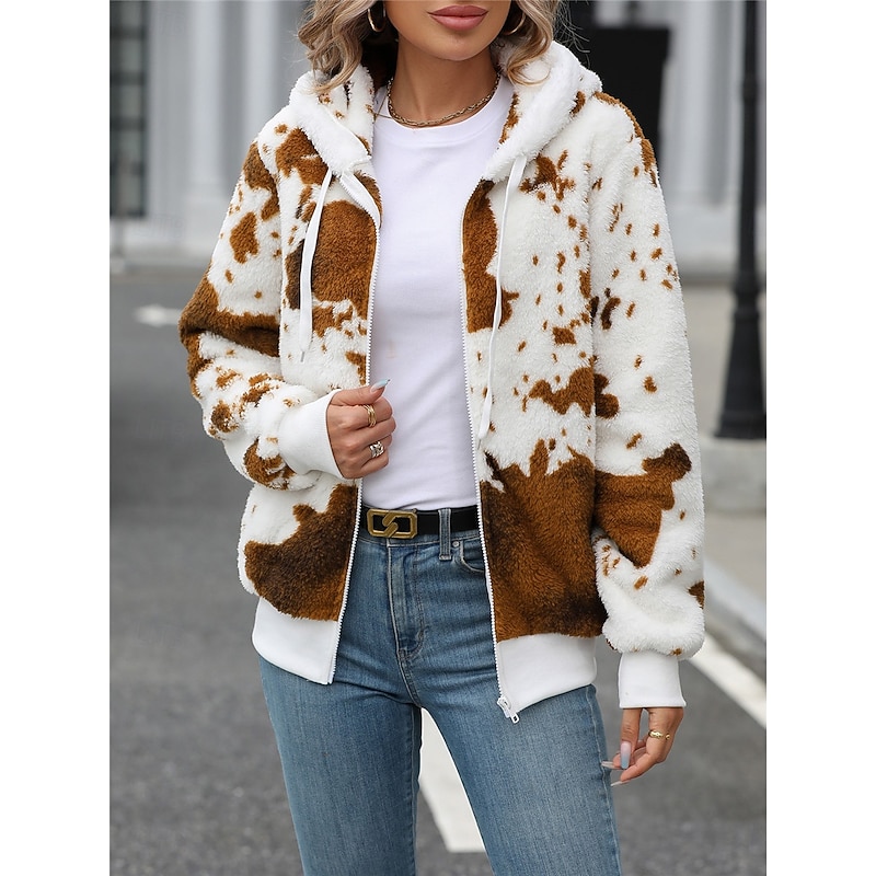 More information about Women's Fleece Jacket Teddy Coat Hoodie Jacket Warm Breathable Zipper Pocket Fleece Lined Casual Cow Print Vacation Street Daily Wear Going out Zipper Regular Hoodie Regular Fit Long Sleeve Outerwear