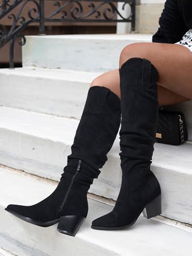 • Stylish Design: Elevate your wardrobe with the SUEDI women's knee high boots. Crafted from 100% stretch suede, they feature a side zipper, wedge block heel and pointed toe for a confident stride, and charming ruching adds the perfect finishing touch