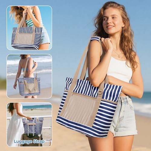HOT ! Fasrom Beach Bag for Women with Zipper, Waterproof Beach Tote with Wet Dry Compartment and Small Pouch for Pool, Swim, Travel