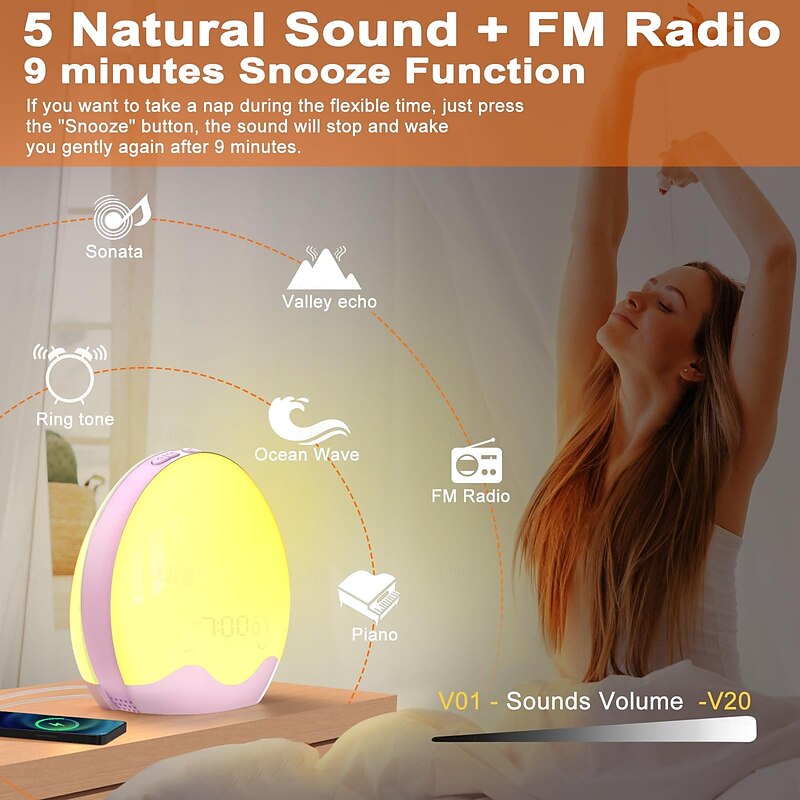 LED Smart Light Sunrise Alarm Clock Wake Up Light for Heavy Sleepers, with 12 Colour Led Night Light, 5 Sets of Nature Sounds and Fm Radio, A Smart Sleep Trainer 5