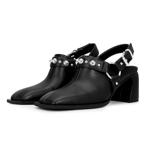 100FIXEO Women's Block Heel Slingback Pumps Studded Strap Buckle Square Toe Comfortable Shoes 6