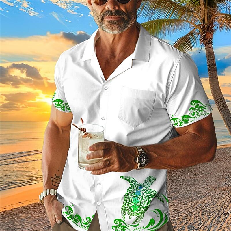 The shirt showcases a classic Cuban collar and features a vibrant tropical pattern with intricate 3D turtle and marine life prints. The button-up front and functional front pocket add practical elegance to the design, making it both functional and fashionable.