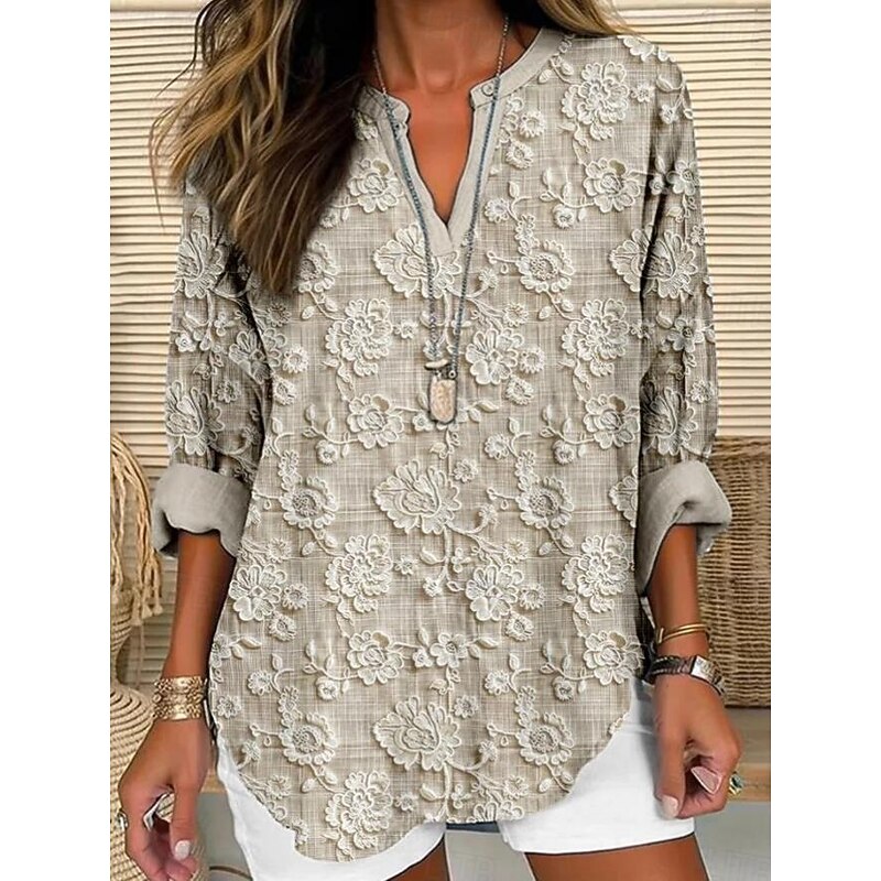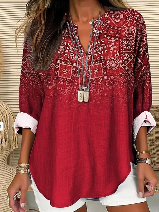HOT ! Women's Blouse Tunic V Neck Long Sleeve Boho Casual Cotton Linen Floral Basic Regular Tops Daily Buttons Print Pink Red Navy Blue Blue Purple