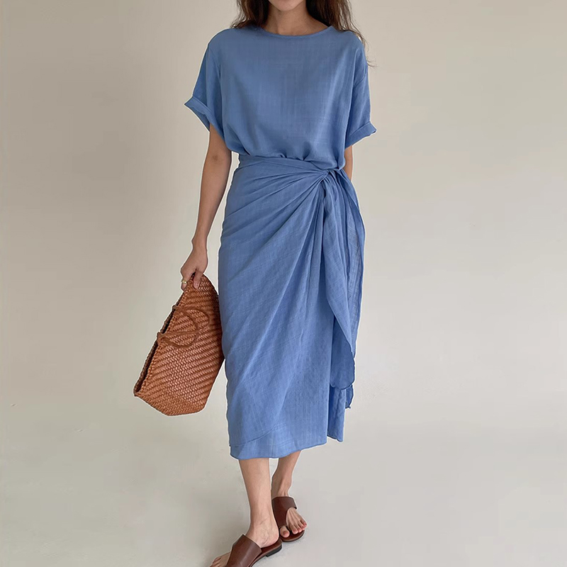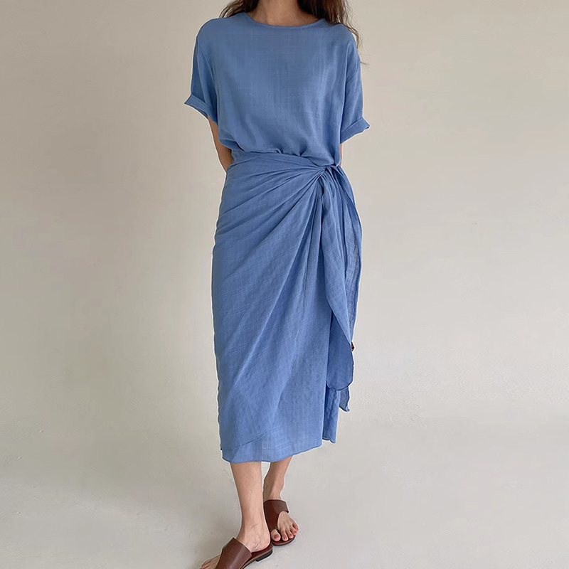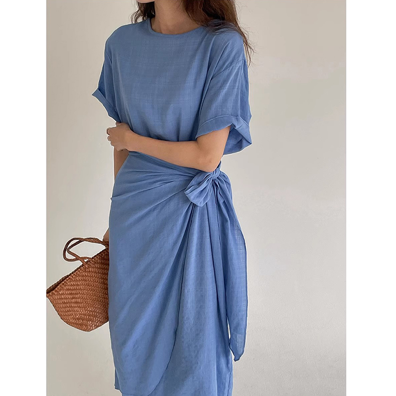 Korejpaa French Style Round Neck Women Dress Elegant Casual Bandage Dresses Female Fold Irregular Slim Short Sleeve Robe