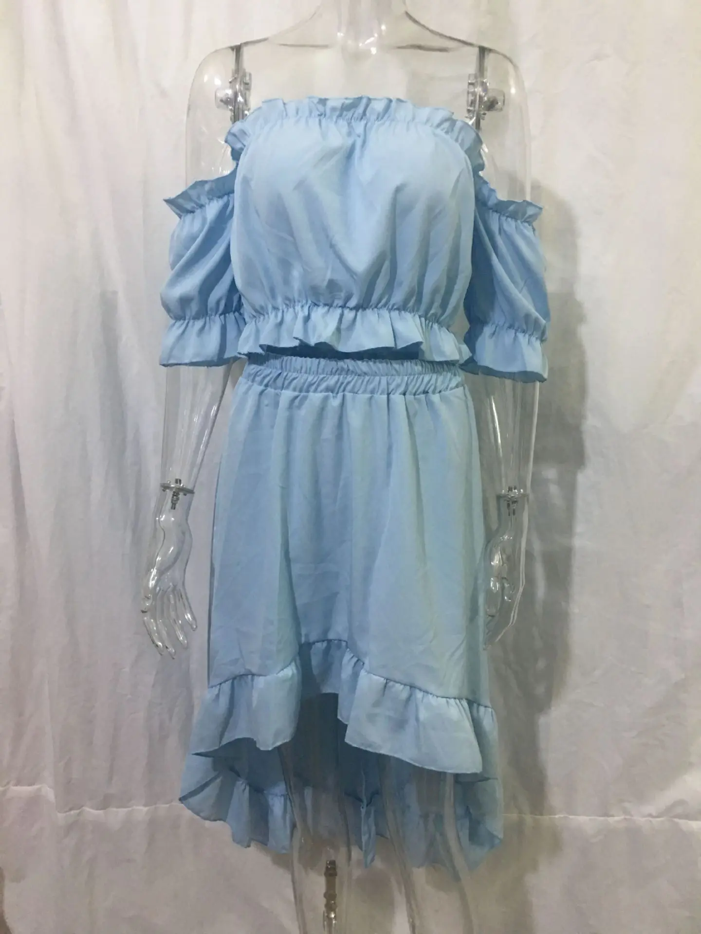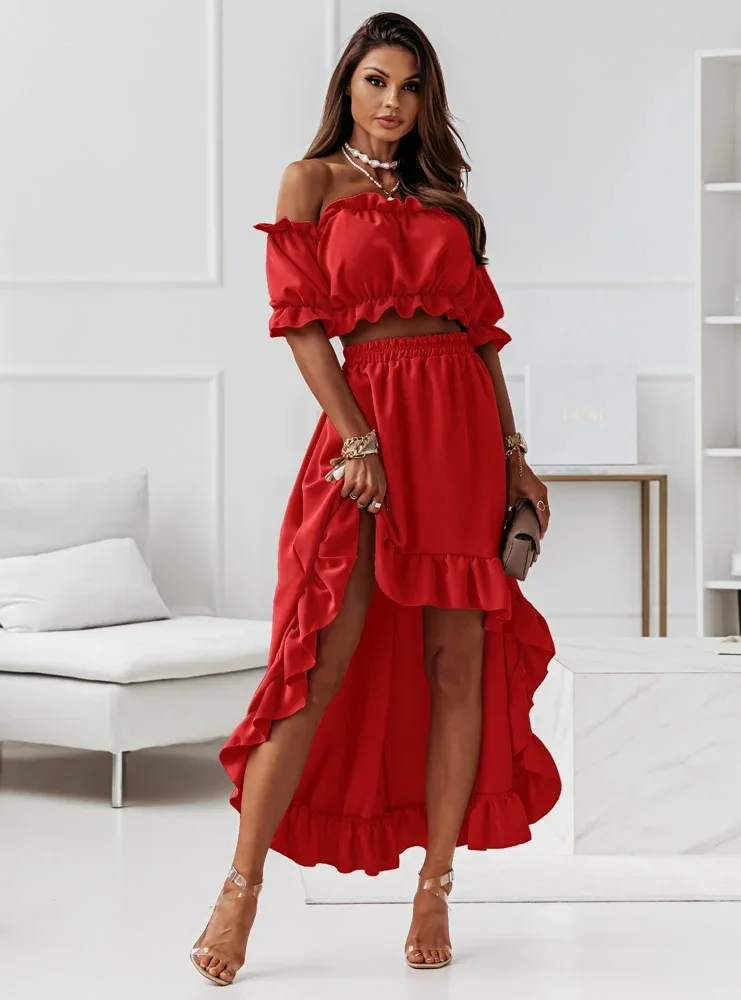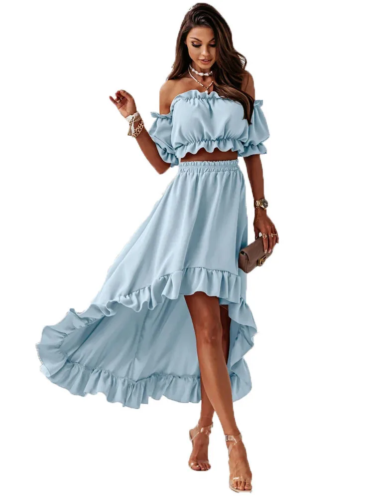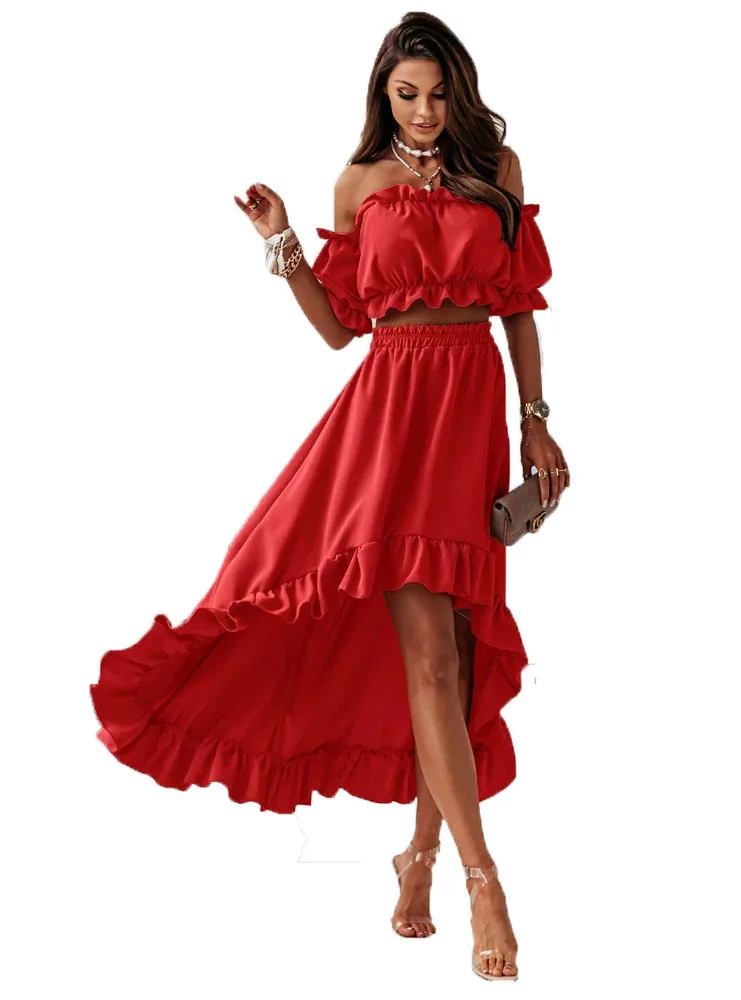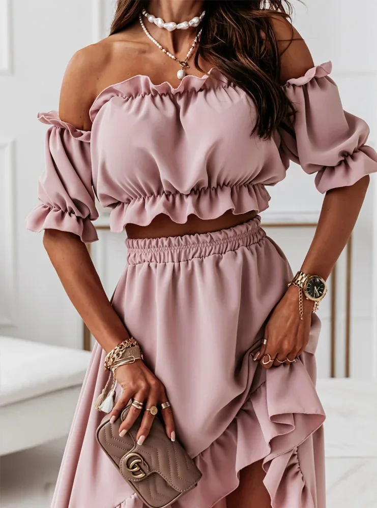 Ladies Two Piece Summer Sexy Short Sleeve Shirt And Slow Skirt Suit Solid Chic Off Shoulder, Puff Sleeve Short Top
