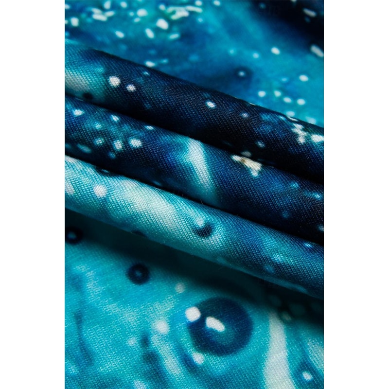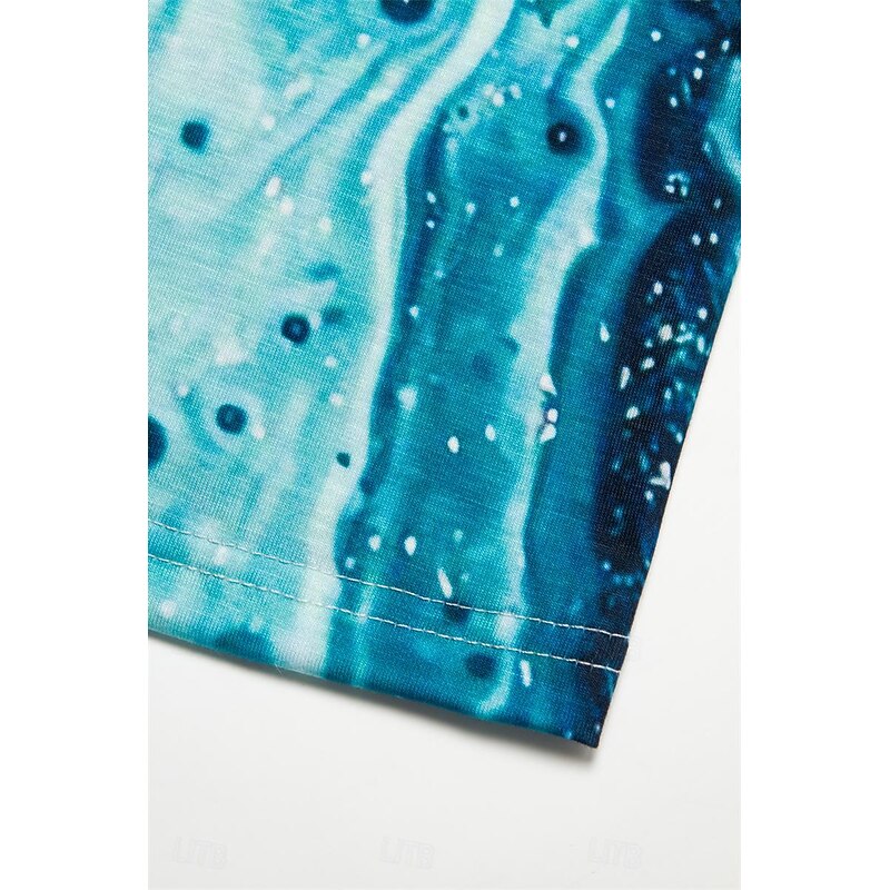 : The dress boasts an eye-catching ombre color block print that seamlessly transitions from blue to white, black, royal blue, sky blue, and light green. Its abstract marble pattern imparts a modern flair, and the unique asymmetrical hemline adds a trendy twist to the overall look.