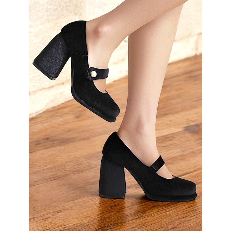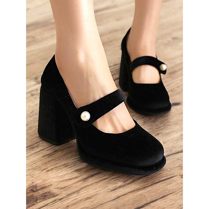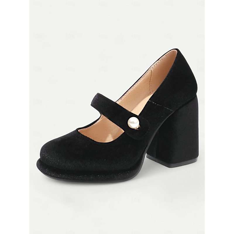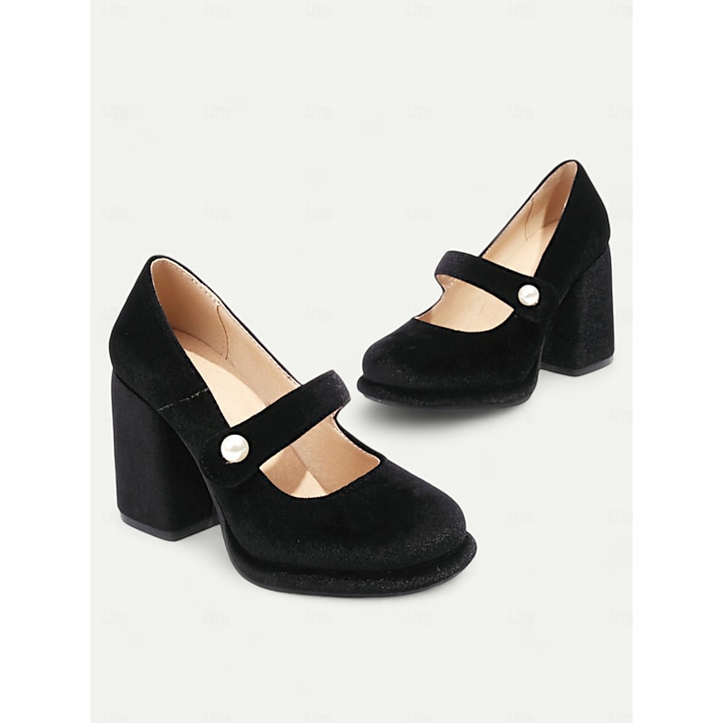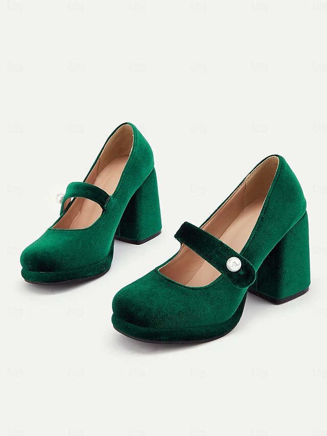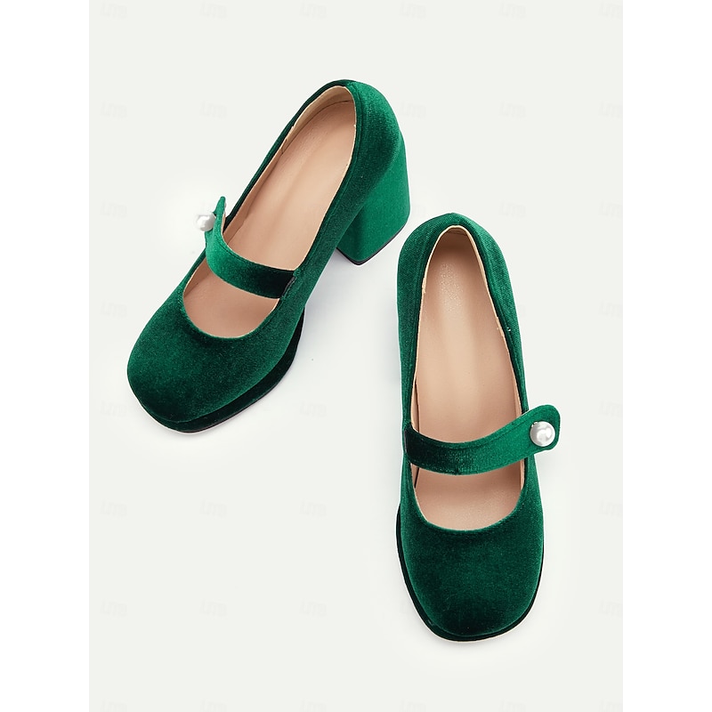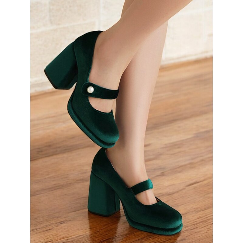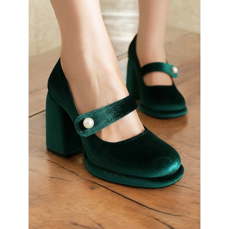 Highlights Fabric : Crafted from a luxurious emerald green velvet, these block heels offer a soft yet resilient upper that beautifully complements any formal or party attire. Shape : Featuring a classic Mary Jane silhouette with a contemporary platform design, these shoes provide a stylish fusion of vintage charm and modern functionality. The block heel ensures stability along with the added height, making them perfect for prolonged wear. Design Highlights : The ankle strap is elegantly adorned with a pearl-like embellishment, adding a touch of chic elegance and a dash of retro flair. The round toe and cushioned insole enhance comfort, allowing you to step out in style and confidence. Occasions : Ideal for a range of events from parties and formal gatherings to everyday work wear, these versatile heels elevate any outfit. Whether paired with a cocktail dress or office ensemble, they promise to impress. Size Notice : Available in a variety of sizes from US5.5 to US10.5, we recommend selecting your usual size for the best fit.