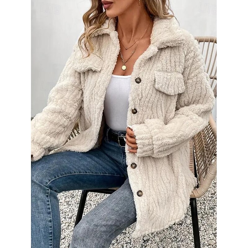More information about Women's Fleece Jacket Teddy Coat Warm Breathable Buttons Pocket Casual Plain Vacation Street Daily Wear Going out Single Breasted Regular Turndown Regular Fit Long Sleeve Outerwear Apricot Fall Winter